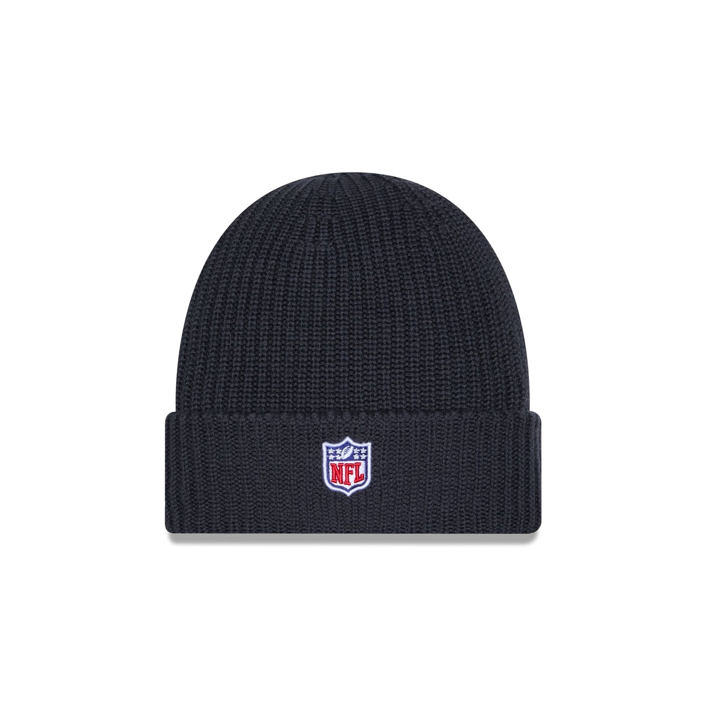 The Houston Texans 2025 Sideline Cold Weather Steel Clouds Cuff Knit Beanie features a sewn-down silicone Texans logo patch at the front cuff with a matching Official NFL Shield logo at the rear. The beanie is knit from wool yarn and lined with fleece.