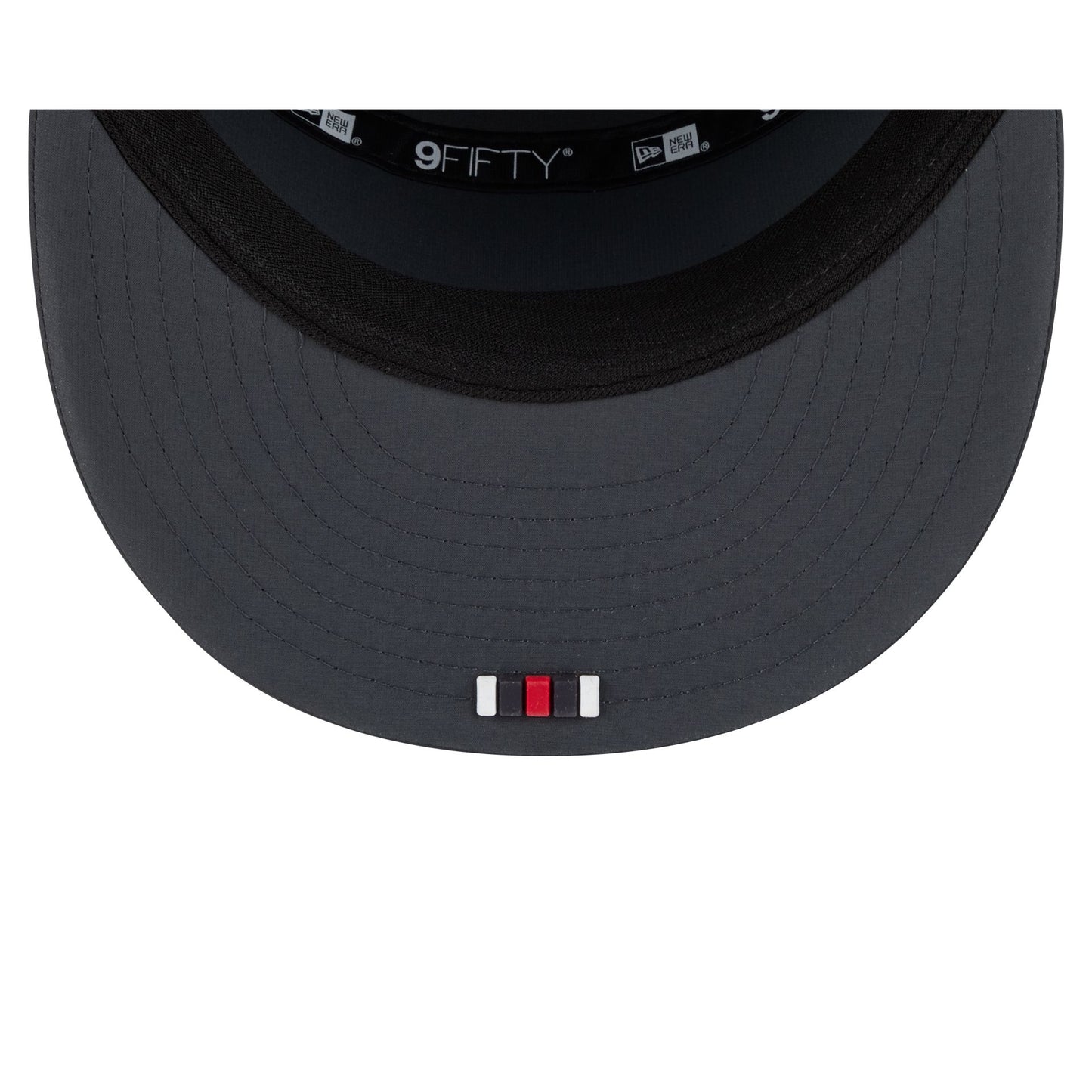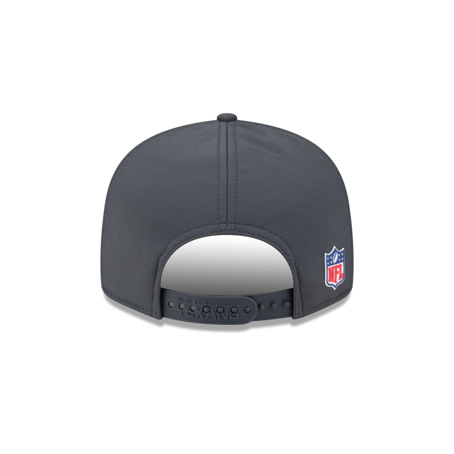 The Houston Texans 2025 Sideline Cold Weather Steel Clouds Split Panel 9FIFTY Snapback features a sewn-down silicone Texans logo patch at the front panels with a split-crown construction and diamond quilting. The cap has a water-repellent quill tech fabrication throughout, with a quick-dry cushioned sweatband to absorb moisture. Additional details include the Official NFL Shield logo to the right of a soft silicone snapback closure at the rear with eyelets at each side panel. The undervisor is accented with a silicone transfer in the team’s colors.