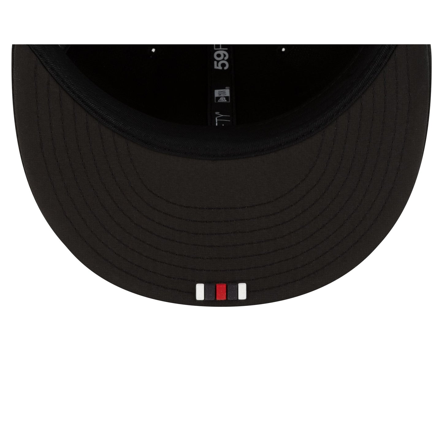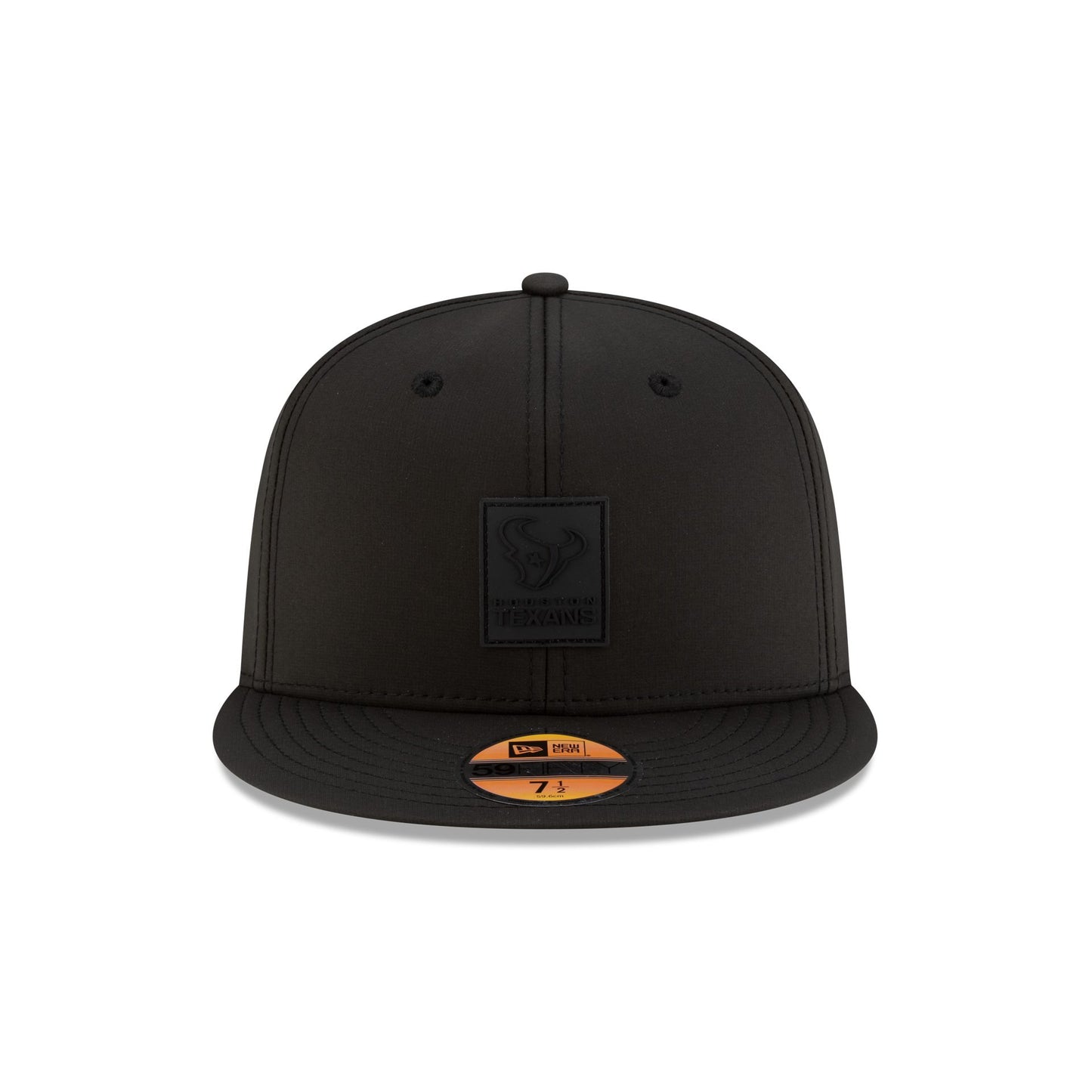 The Houston Texans 2025 Sideline Hot Weather Black 59FIFTY Fitted Cap features a sewn-down silicone Texans logo patch at the front panels with the Official NFL Shield logo at the rear. The cap has a water-repellent quill tech fabrication throughout, with a quick-dry cushioned sweatband to absorb moisture. The undervisor is accented with a silicone transfer in the team’s colors.