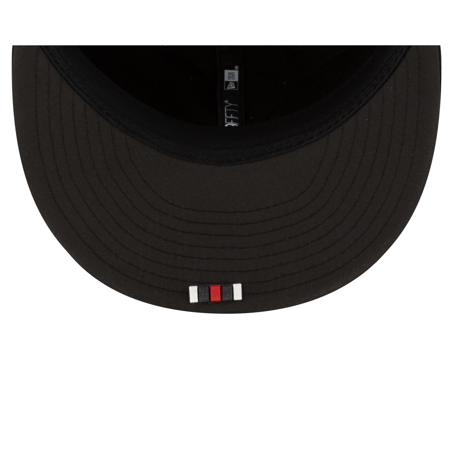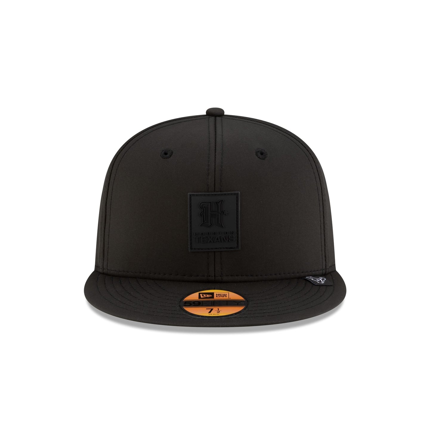 The Houston Texans 2025 Sideline Hot Weather H Black 59FIFTY Fitted Cap features a sewn-down silicone Texans logo patch at the front panels with the Official NFL Shield logo at the rear. The cap has a water-repellent quill tech fabrication throughout, with a quick-dry cushioned sweatband to absorb moisture. The undervisor is accented with a silicone transfer in the team’s colors.