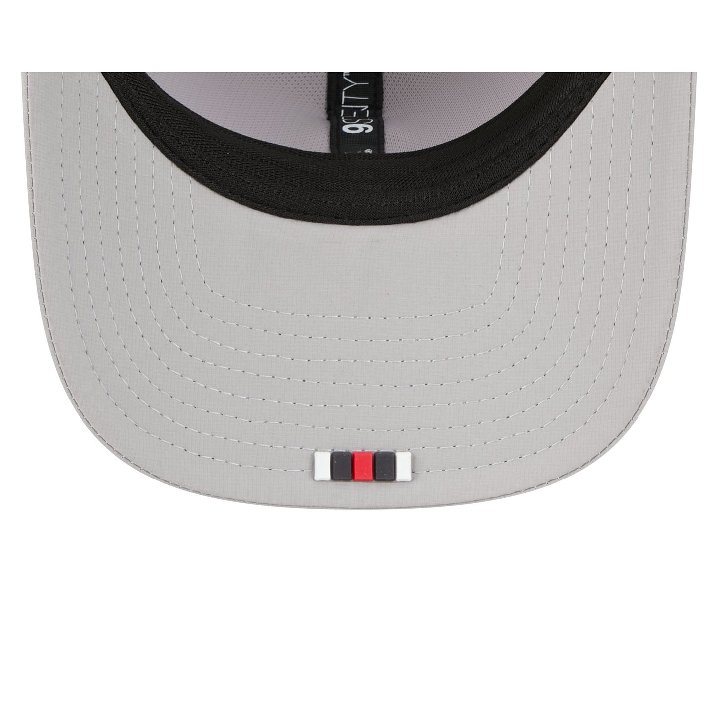 The Houston Texans 2025 Sideline Hot Weather Gray 9SEVENTY Trucker features a sewn-down silicone Texans logo patch at the front panels with a water-repellent quill tech fabrication throughout and a quick-dry cushioned sweatband to absorb moisture. Additional details include the Official NFL Shield logo to the right of a soft silicone snapback closure at a light-weight mesh rear. The undervisor is accented with a silicone transfer in the team’s colors.