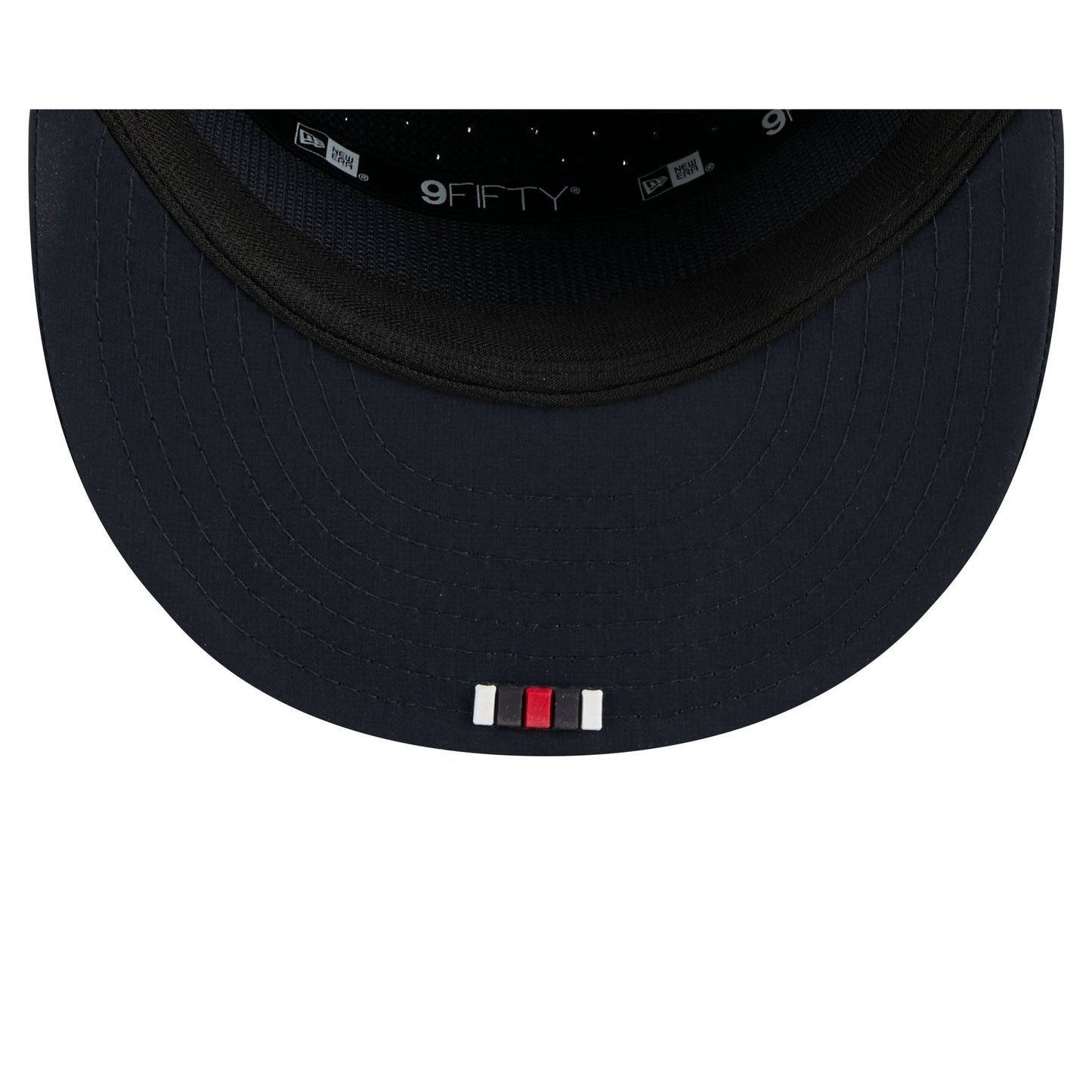 The Houston Texans 2025 Sideline Hot Weather Split Panel 9FIFTY Snapback features a sewn-down silicone Texans logo patch at the front panels with a split-crown construction. The cap has a water-repellent quill tech fabrication throughout, with a quick-dry cushioned sweatband to absorb moisture. Additional details include the Official NFL Shield logo to the right of a soft silicone snapback closure at the rear. The undervisor is accented with a silicone transfer in the team’s colors.
