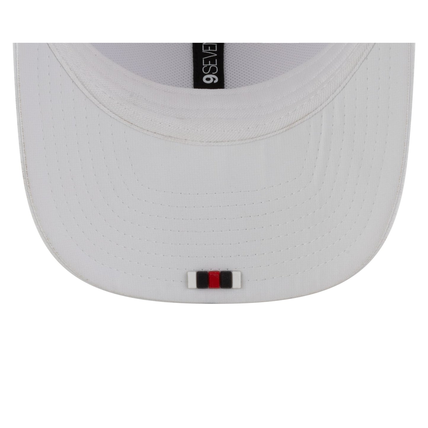 The Houston Texans 2025 Sideline Hot Weather White 9SEVENTY Trucker features a sewn-down silicone Texans logo patch at the front panels with a water-repellent quill tech fabrication throughout and a quick-dry cushioned sweatband to absorb moisture. Additional details include the Official NFL Shield logo to the right of a soft silicone snapback closure at a light-weight mesh rear. The undervisor is accented with a silicone transfer in the team’s colors.
