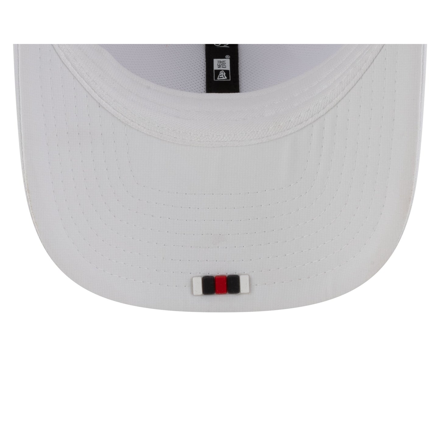 The Houston Texans 2025 Sideline Hot Weather White H 9SEVENTY Trucker features a sewn-down silicone Texans logo patch at the front panels with a water-repellent quill tech fabrication throughout and a quick-dry cushioned sweatband to absorb moisture. Additional details include the Official NFL Shield logo to the right of a soft silicone snapback closure at a light-weight mesh rear. The undervisor is accented with a silicone transfer in the team’s colors.