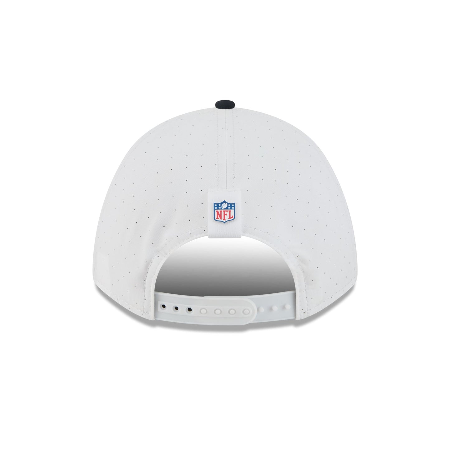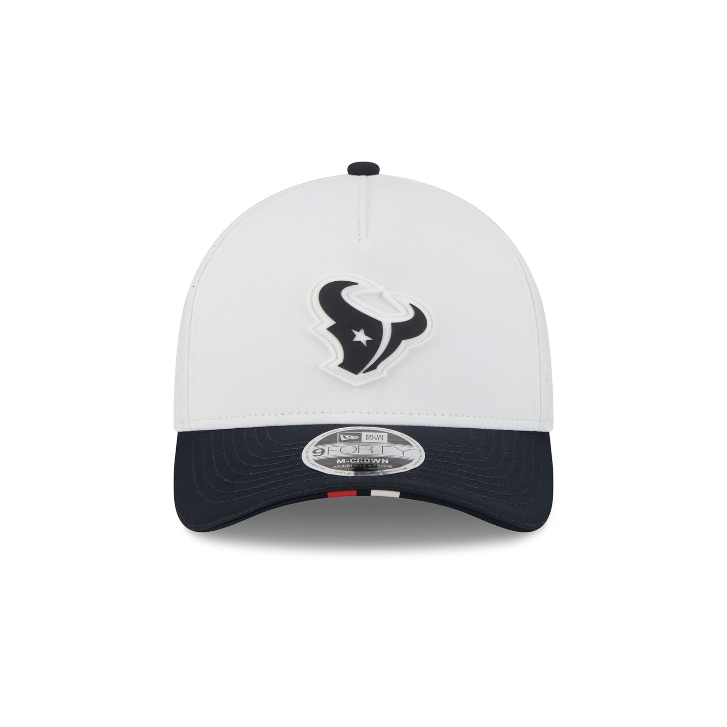 The Houston Texans 2025 Training 9FORTY M-Crown A-Frame Snapback features a silicone Texans patch at the front panel with team color stripes at the front of a navy visor. Additional details include a silicone NFL Shield patch on a woven foldover tab above a snapback closure at the rear.