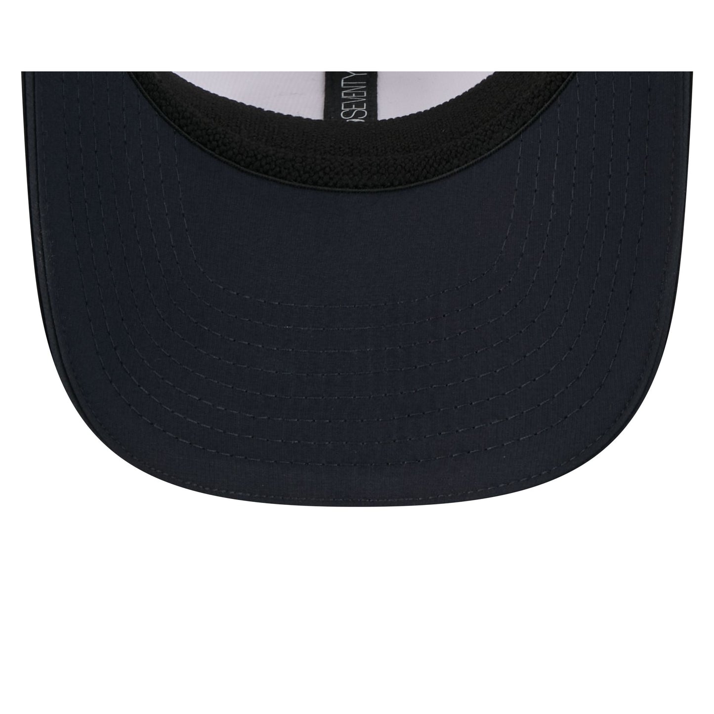 The Houston Texans 2025 Training 9SEVENTY Stretch-Snap Cap features a silicone Texans patch at the front panels with team color stripes at the front of a navy visor. Additional details include a silicone NFL Shield patch on a woven foldover tab above a snapback closure at the rear.