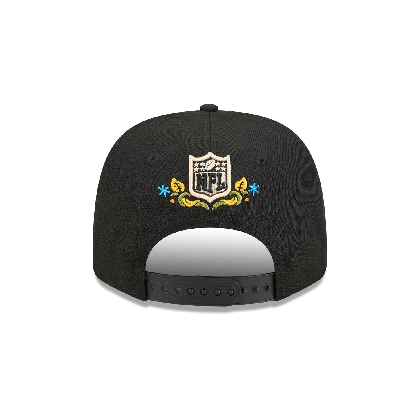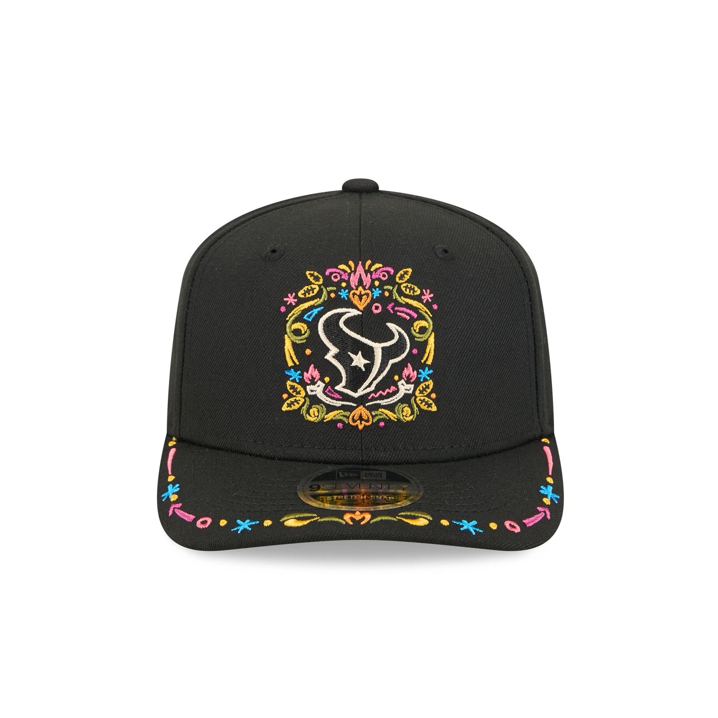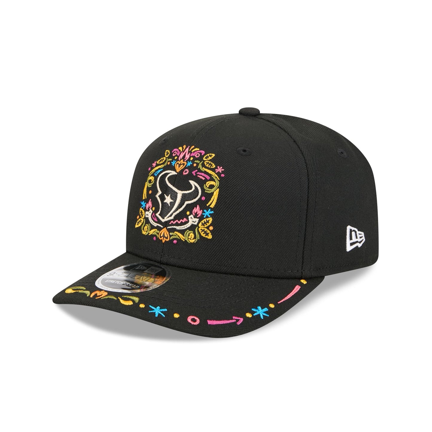 The Houston Texans Hasta La Muerte 9SEVENTY Stretch-Snap features an embroidered Texans logo and Day of the Dead design at the front panels. Additional details include design at the visor, and an undervisor that reads: Tradición, Corazón y Legado, meaning Tradition, Heart and Legacy. A matching NFL Shield is shown at the rear with an adjustable snapback closure.