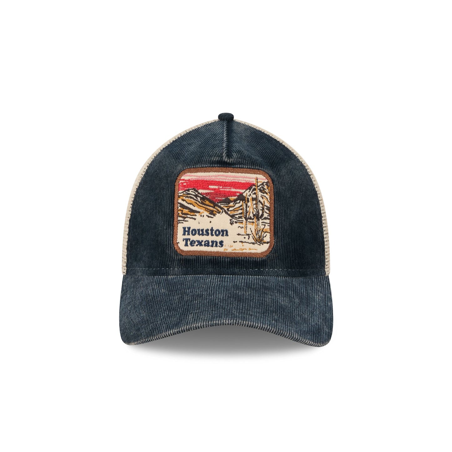 The Houston Texans Vintage Landscape 9TWENTY A-Frame Trucker features an embroidered Texans Vintage Landscape patch at the front panels with a team logo at the right-wear side. Additional details include an adjustable snapback closure at the rear and a gray undervisor.