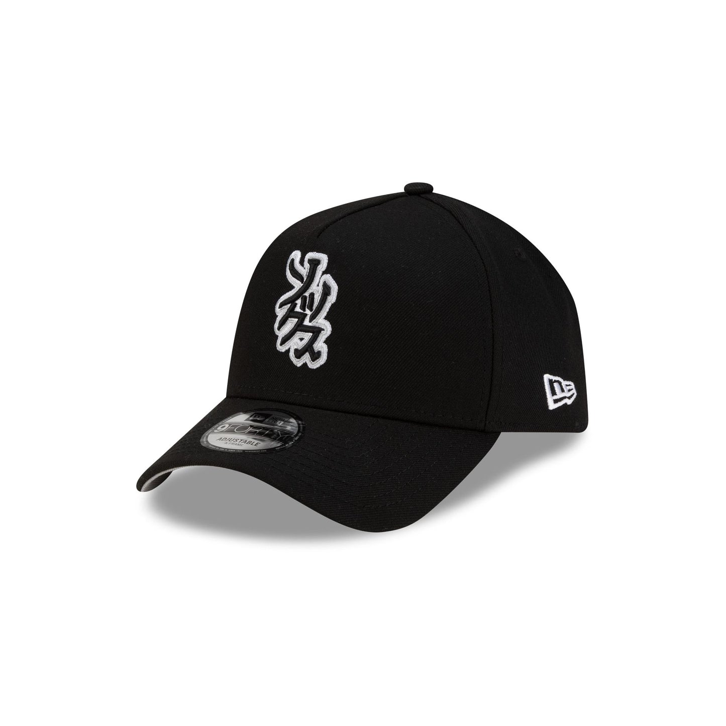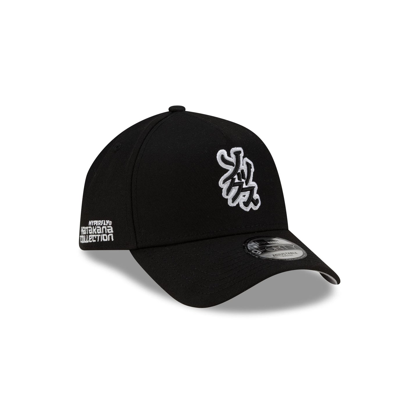 The Hyperfly Katakana x Chicago White Sox 9FORTY A-Frame Snapback features an embroidered White Sox Katakana themed logo at the front panels with a matching The Katakana Collection script at the right-wear side. Additional details include a team logo above an adjustable snapback closure at the rear and a gray undervisor.