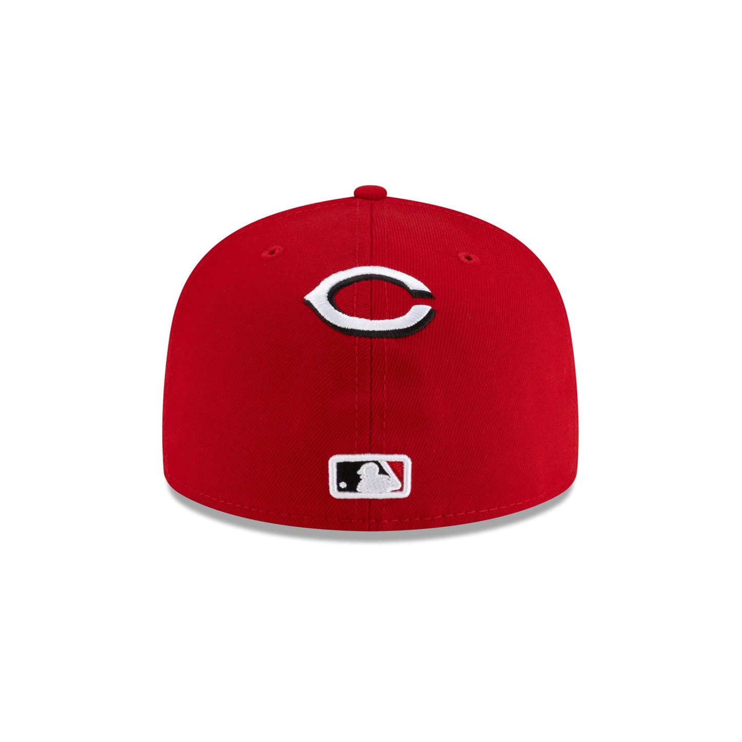 The Hyperfly Katakana x Cincinnati Reds 59FIFTY Fitted Cap features an embroidered Reds Katakana themed logo at the front panels with a matching The Katakana Collection script at the right-wear side. Additional details include a team logo above a matching MLB Batterman logo at the rear and a gray undervisor.