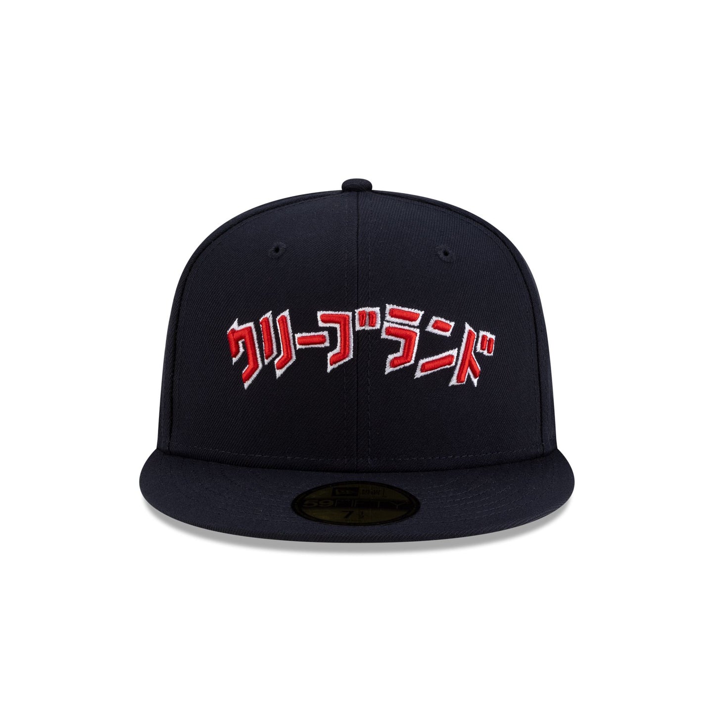 The Hyperfly Katakana x Cleveland Guardians 59FIFTY Fitted Cap features an embroidered Guardians Katakana themed logo at the front panels with a matching The Katakana Collection script at the right-wear side. Additional details include a team logo above a matching MLB Batterman logo at the rear and a gray undervisor.