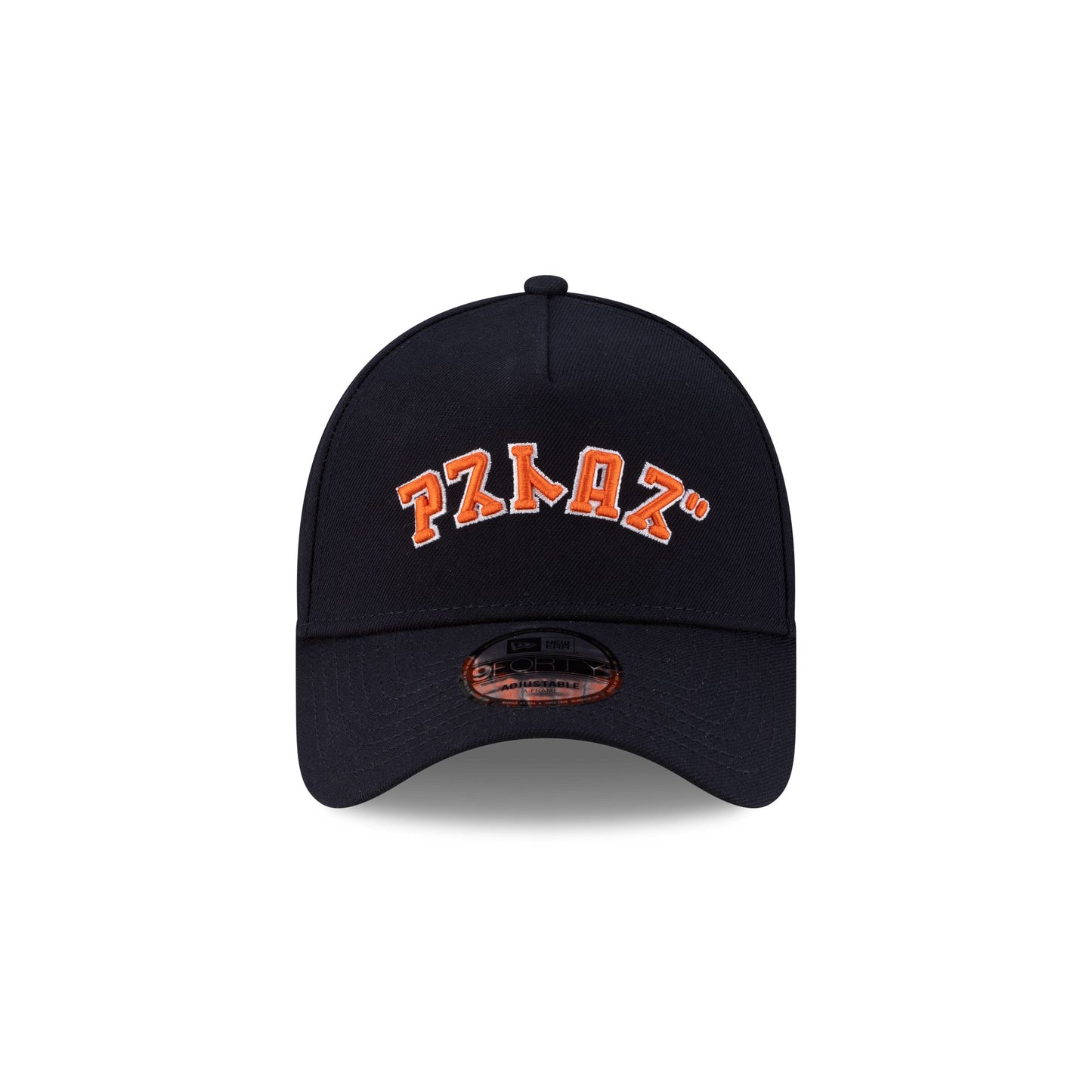 The Hyperfly Katakana x Houston Astros 9FORTY A-Frame Snapback features an embroidered Astros Katakana themed logo at the front panels with a matching The Katakana Collection script at the right-wear side. Additional details include a team logo above an adjustable snapback closure at the rear and a gray undervisor.