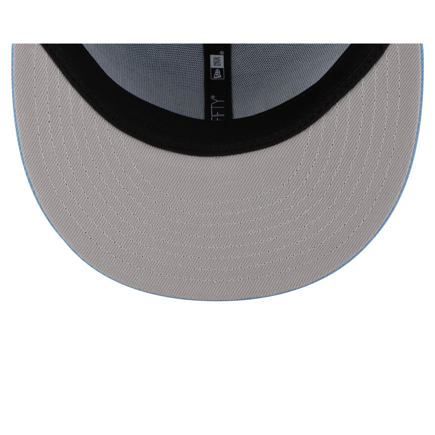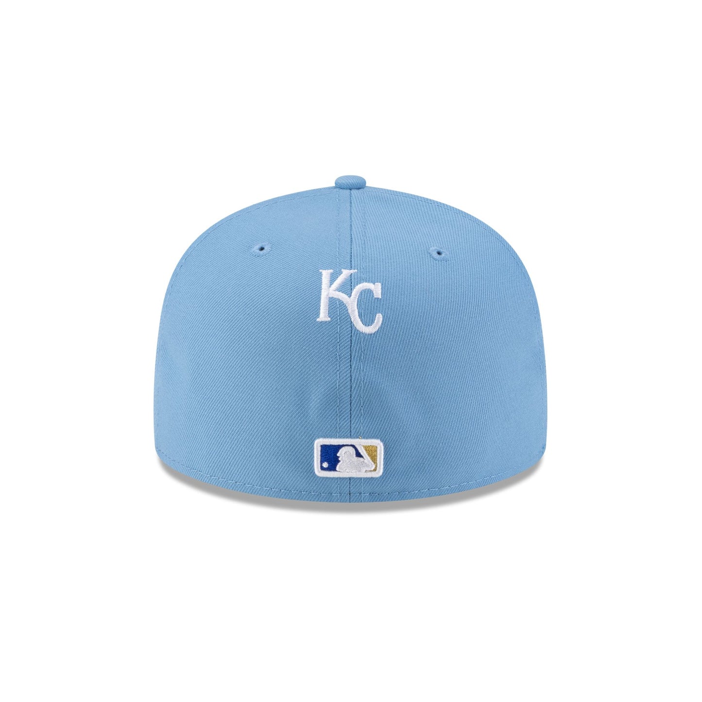 The Hyperfly Katakana x Kansas City Royals 59FIFTY Fitted Cap features an embroidered Royals Katakana themed logo at the front panels with a matching The Katakana Collection script at the right-wear side. Additional details include a team logo above a matching MLB Batterman logo at the rear and a gray undervisor.