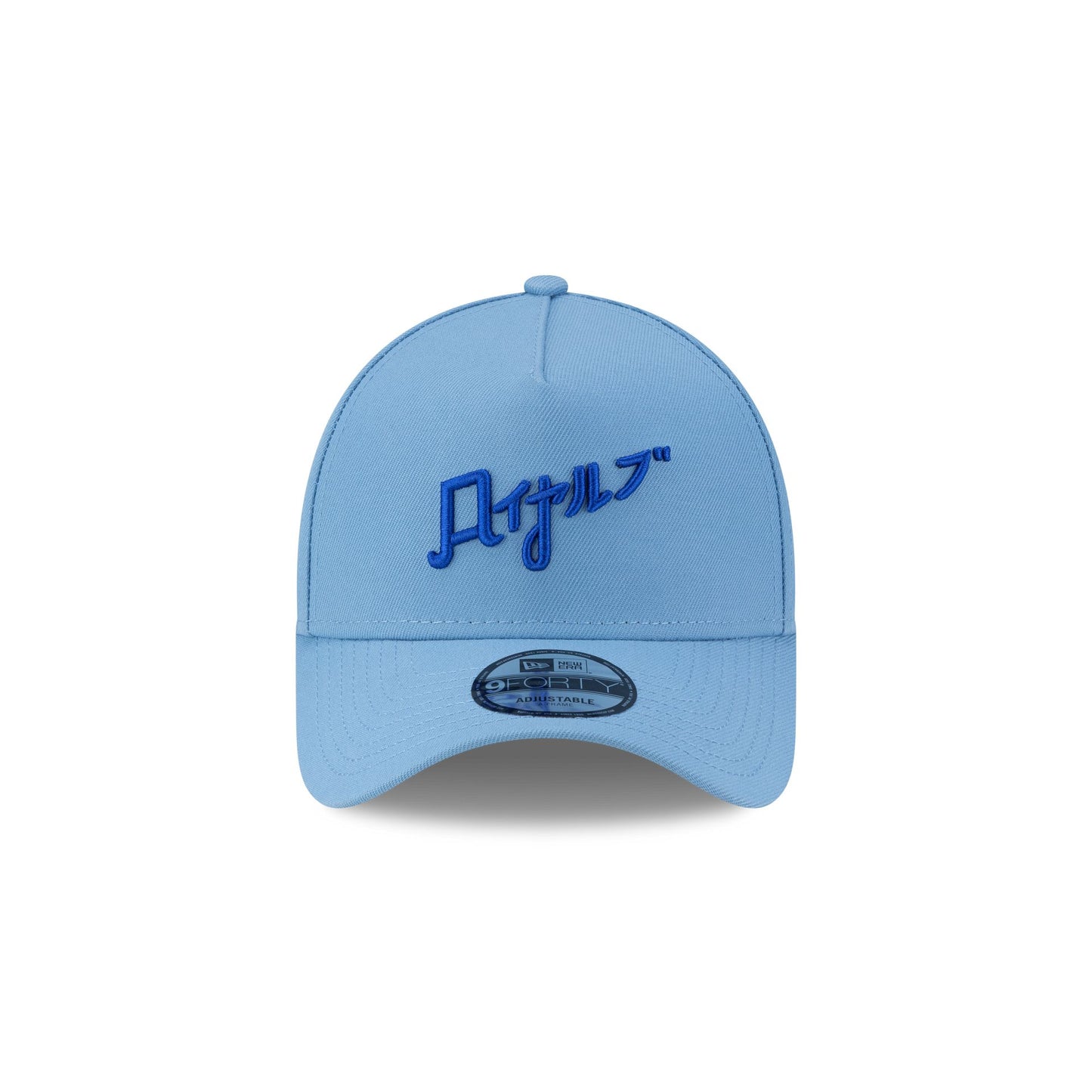 The Hyperfly Katakana x Kansas City Royals 9FORTY A-Frame Snapback features an embroidered Royals Katakana themed logo at the front panels with a matching The Katakana Collection script at the right-wear side. Additional details include a team logo above an adjustable snapback closure at the rear and a gray undervisor.
