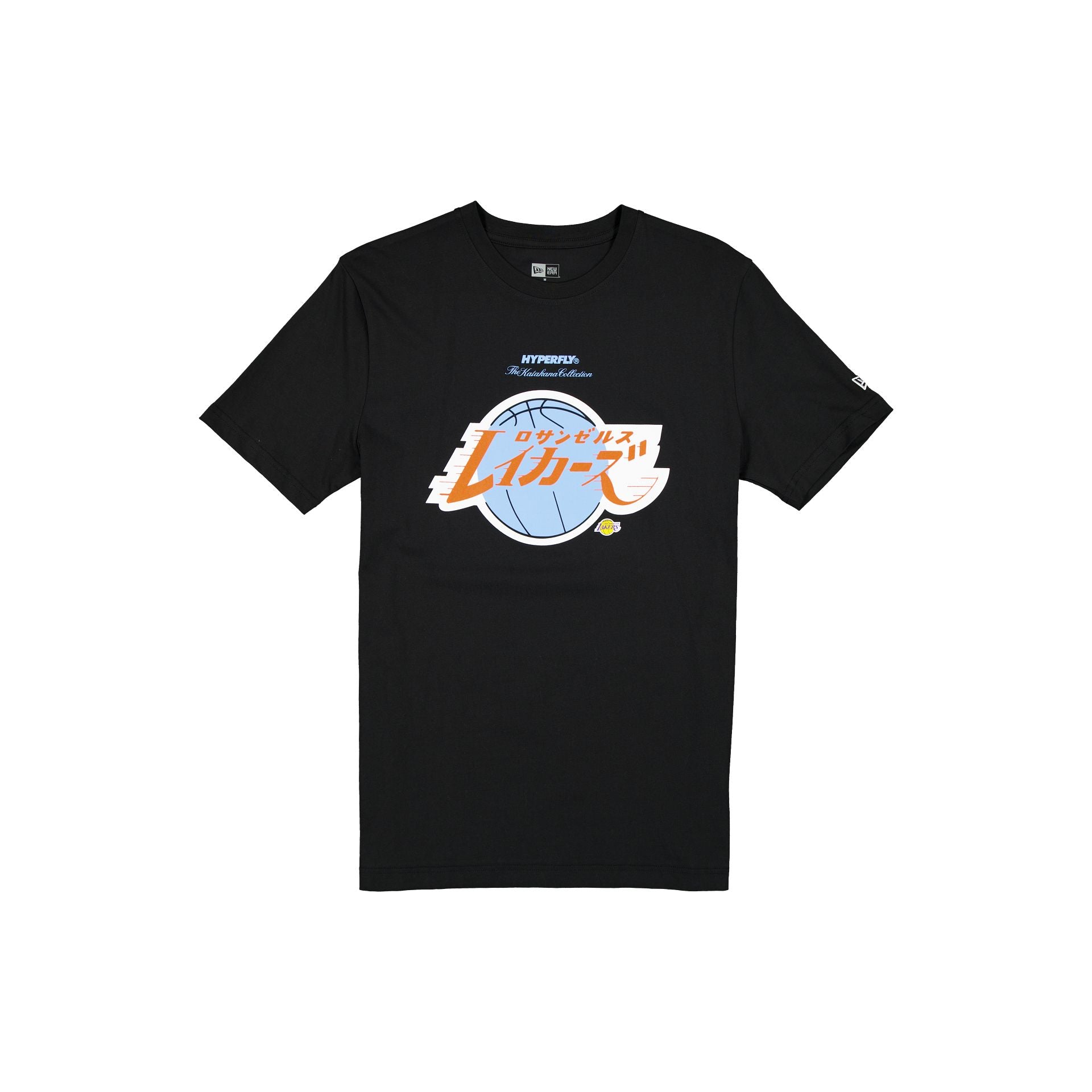 The Los Angeles Lakers 2025 All-Star Game T-Shirt features a blue and orange screen-printed Katakana-themed Lakers graphic at the front.