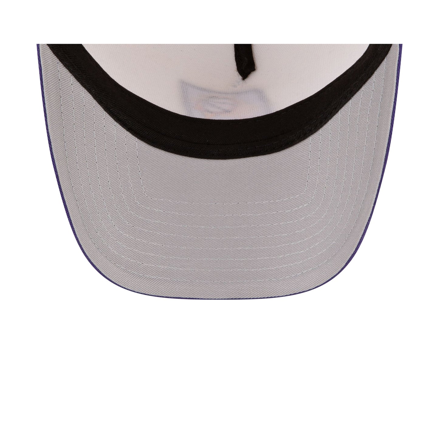The Hyperfly Katakana X Phoenix Suns 9FORTY A-Frame Snapback features an embroidered katakana themed Suns logo at the front panels with a matching The Katakana Collection script at the right-wear side. Additional details include a purple visor, a gray undervisor, and a Hyperfly wordmark at the left of a snapback closure at the rear.