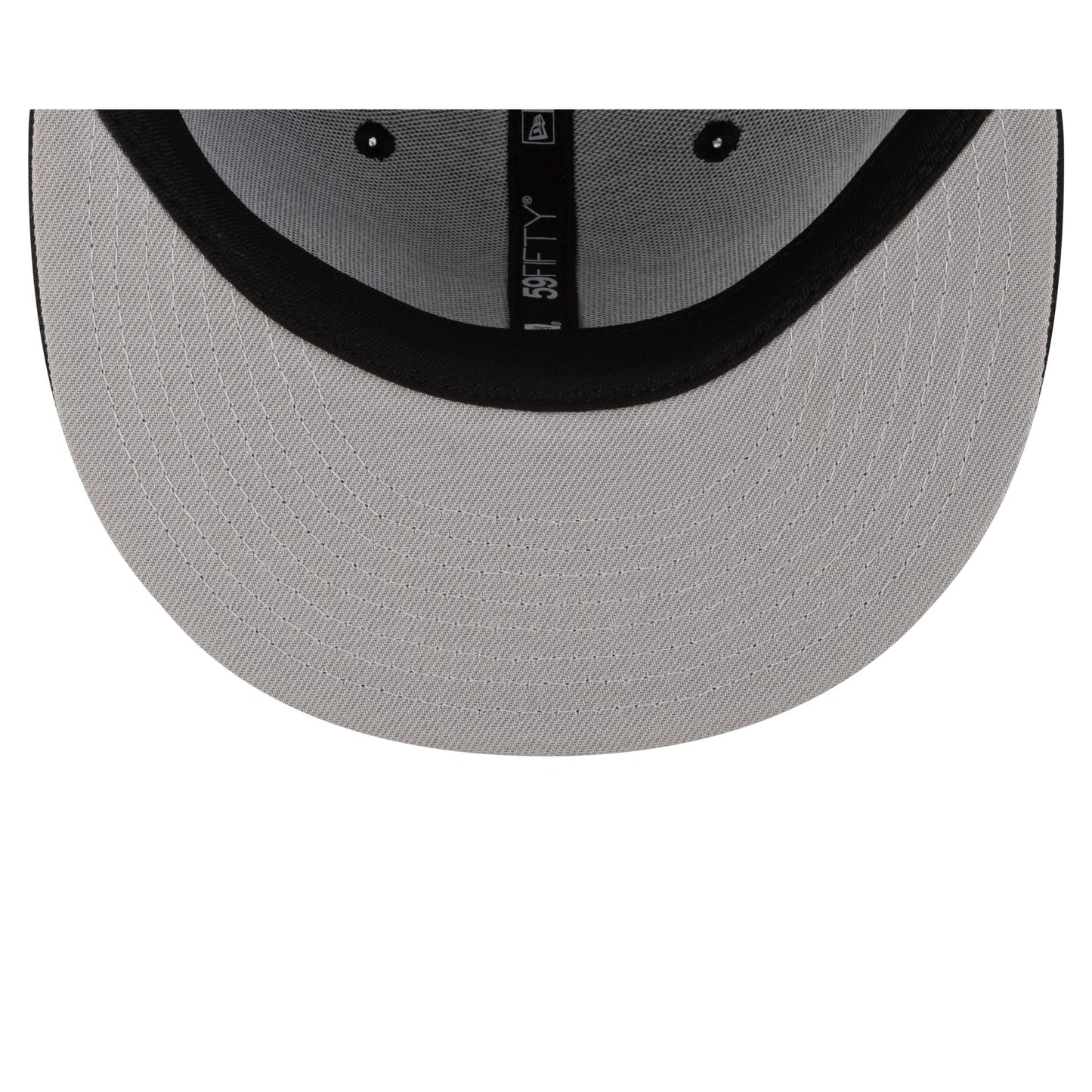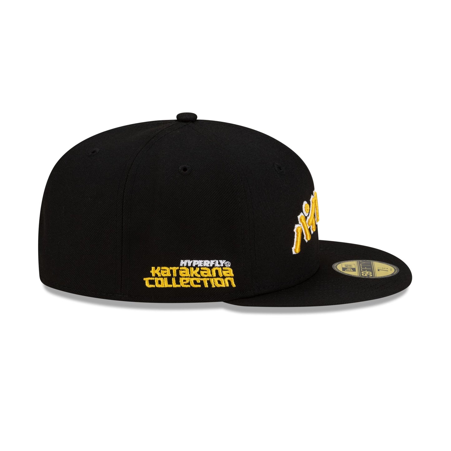 The Hyperfly Katakana x Pittsburgh Pirates 59FIFTY Fitted Cap features an embroidered Pirates Katakana themed logo at the front panels with a matching The Katakana Collection script at the right-wear side. Additional details include a team logo above a matching MLB Batterman logo at the rear and a gray undervisor.