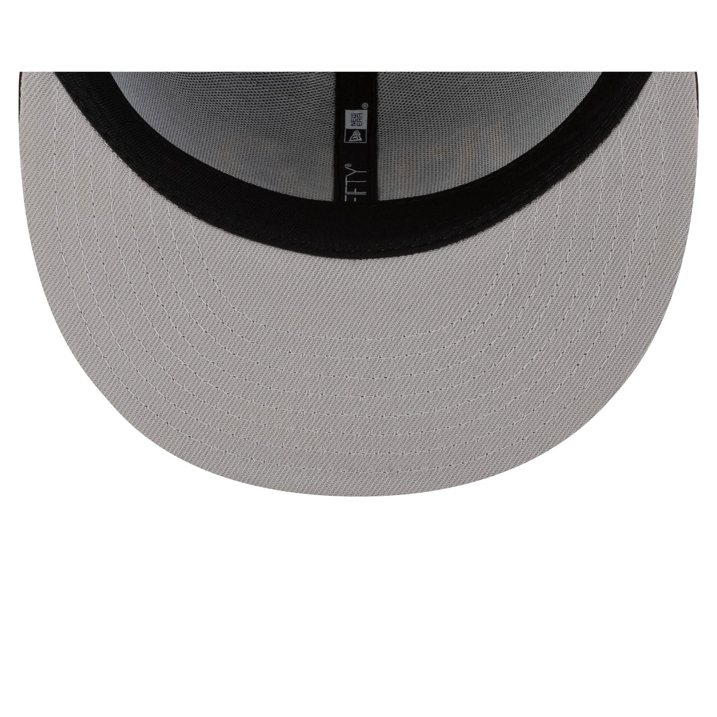 The Hyperfly Katakana x San Diego Padres 59FIFTY Fitted Cap features an embroidered Padres Katakana themed logo at the front panels with a matching The Katakana Collection script at the right-wear side. Additional details include a team logo above a matching MLB Batterman logo at the rear and a gray undervisor.