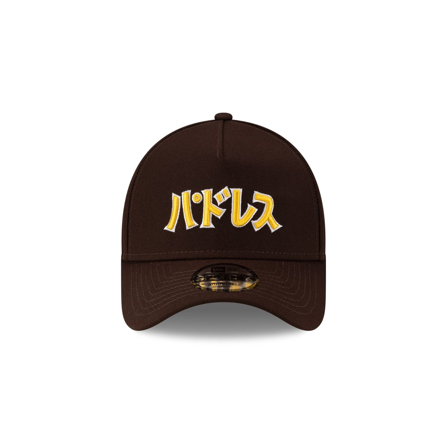 The Hyperfly Katakana x San Diego Padres 9FORTY A-Frame Snapback features an embroidered Padres Katakana themed logo at the front panels with a matching The Katakana Collection script at the right-wear side. Additional details include a team logo above an adjustable snapback closure at the rear and a gray undervisor.