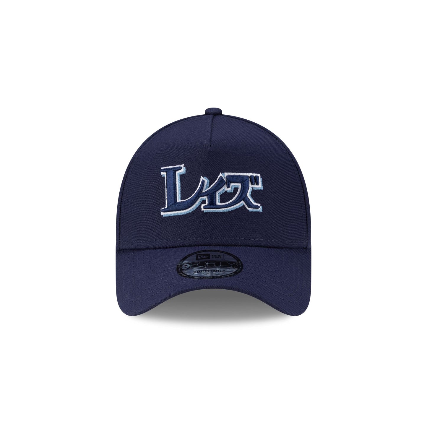 The Hyperfly Katakana x Tampa Bay Rays 9FORTY A-Frame Snapback features an embroidered Rays Katakana themed logo at the front panels with a matching The Katakana Collection script at the right-wear side. Additional details include a team logo above an adjustable snapback closure at the rear and a gray undervisor.
