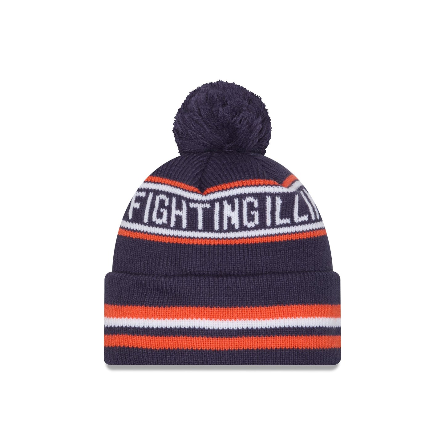 The Illinois Fighting Illini Classic Pom Knit Hat features an embroidered Illini logo at the front cuff with a wordmark at the crown and a one-time removable pom.