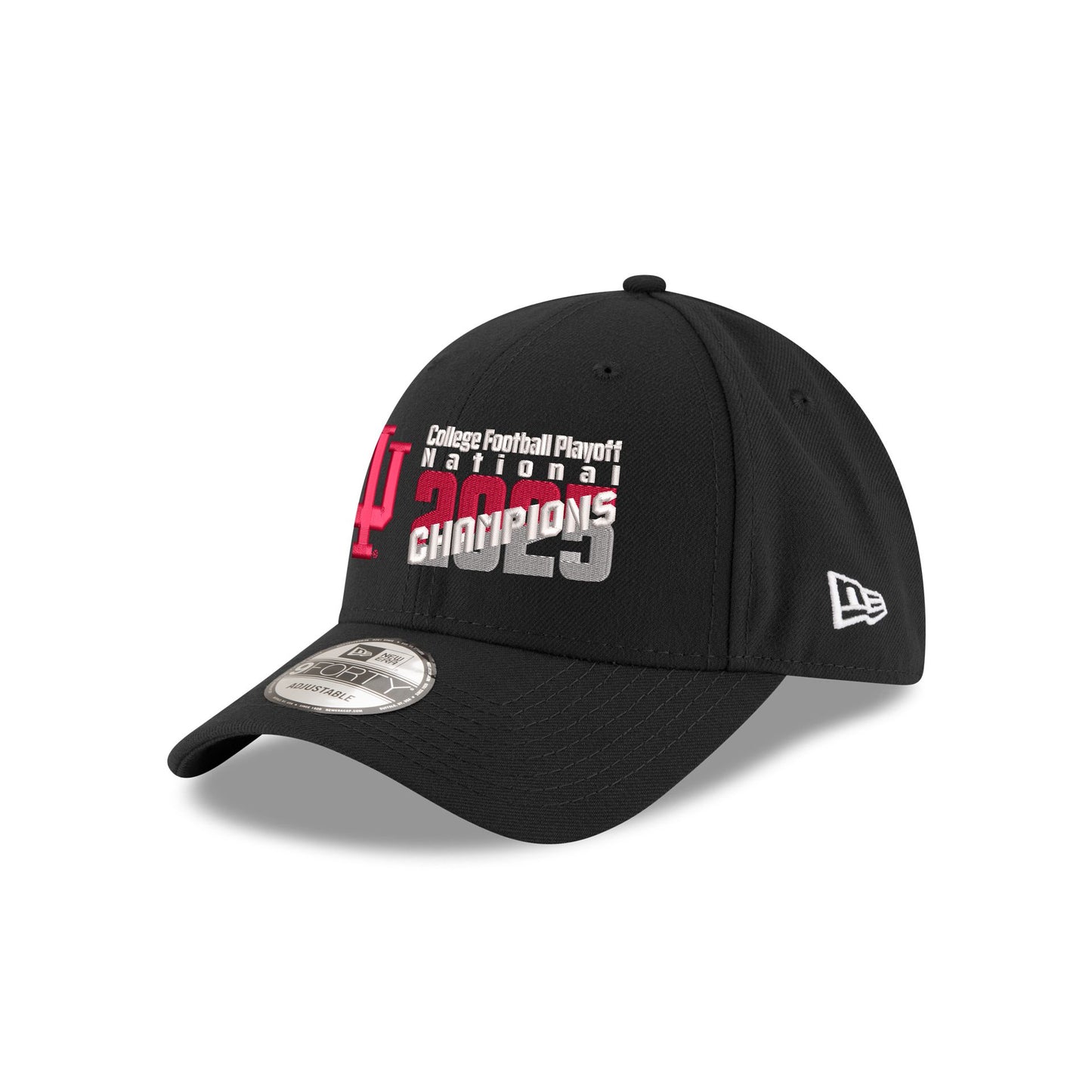 The Indiana Hoosiers 2025-2026 College Football Champions 9FORTY Adjustable Cap features an embroidered Hoosiers 2025 National College Football Playoff Champions graphic at the front panels with a National Championship patch at the right-wear side. Additional details include an adjustable hook-and-loop closure at the rear.