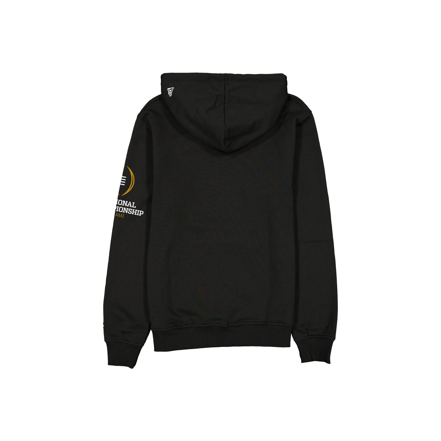 The Indiana Hoosiers 2025-2026 College Football Champions Black Hoodie features a screen-printed Hoosiers 2025 College Football Playoffs National Champions graphic at the front with kangaroo pockets and adjustable drawstrings at the hood. Additional details include a National Championship screen-print patch at the left arm.