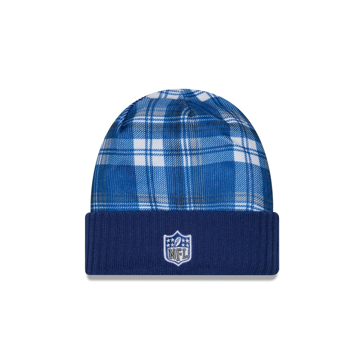 The Indianapolis Colts 2024 Cold Weather Statement Knit Beanie features an embroidered Colts logo at the front cuff with a matching NFL Shield at the rear and a plaid print throughout the crown.