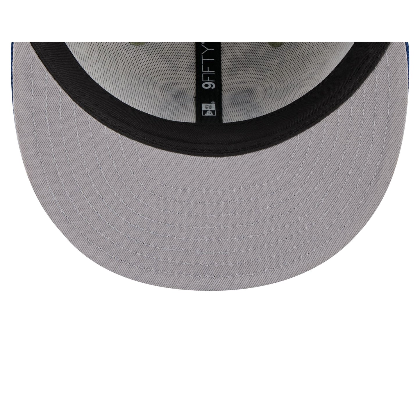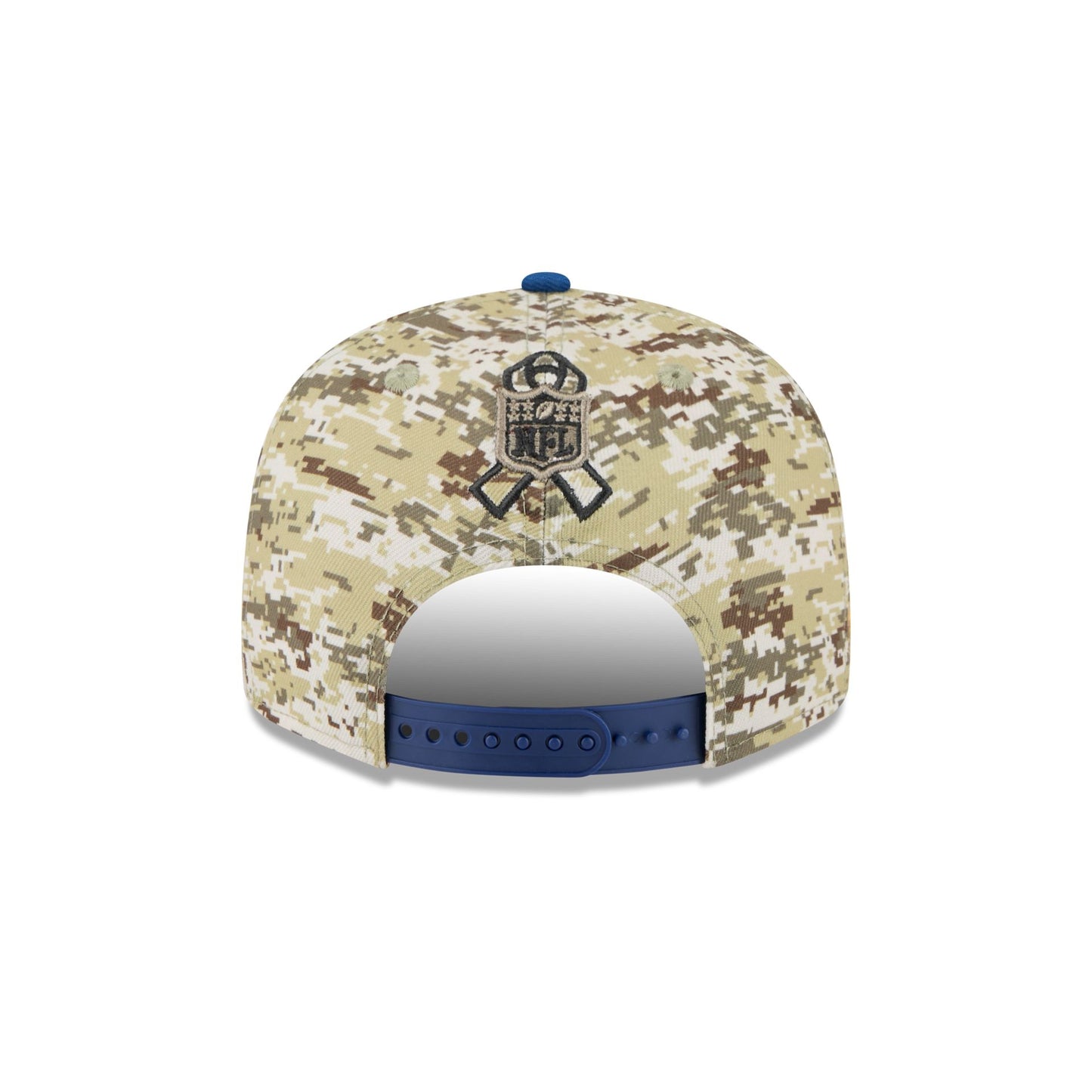 The Indianapolis Colts 2025 Salute to Service Fan Gear 9FIFTY Snapback features an embroidered Colts logo at the front panels with the official NFL Salute to Service patch above a snapback closure at the rear. Additional details include an American flag patch at the right-wear side with team color visor and a gray undervisor.