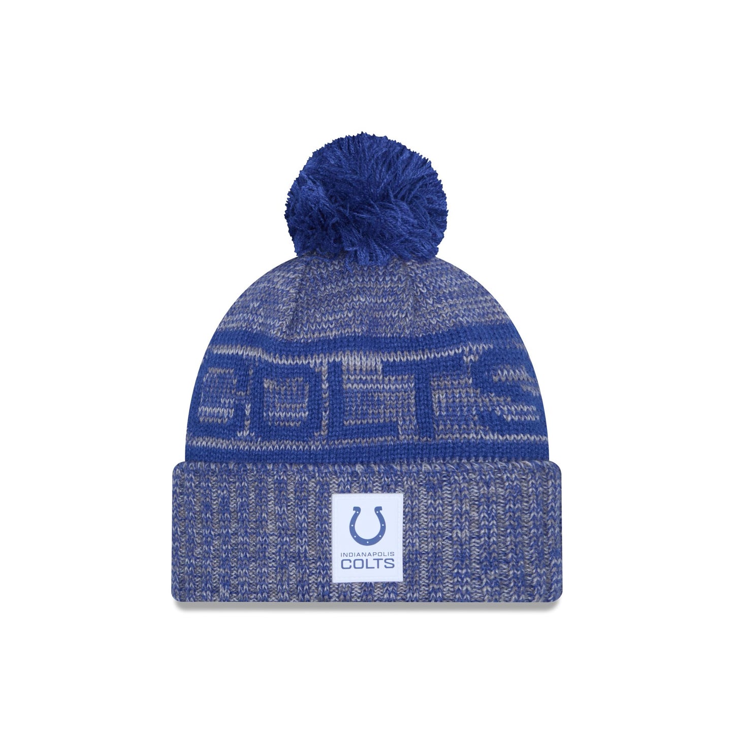 The Indianapolis Colts 2025 Sideline Cold Weather Gray Pom Knit Hat features a sewn-down silicone Colts white logo patch at the front cuff with a matching Official NFL Shield logo at the rear. Additional details include a team wordmark across the crown, a one-time removeable pom, and a fleece lining.