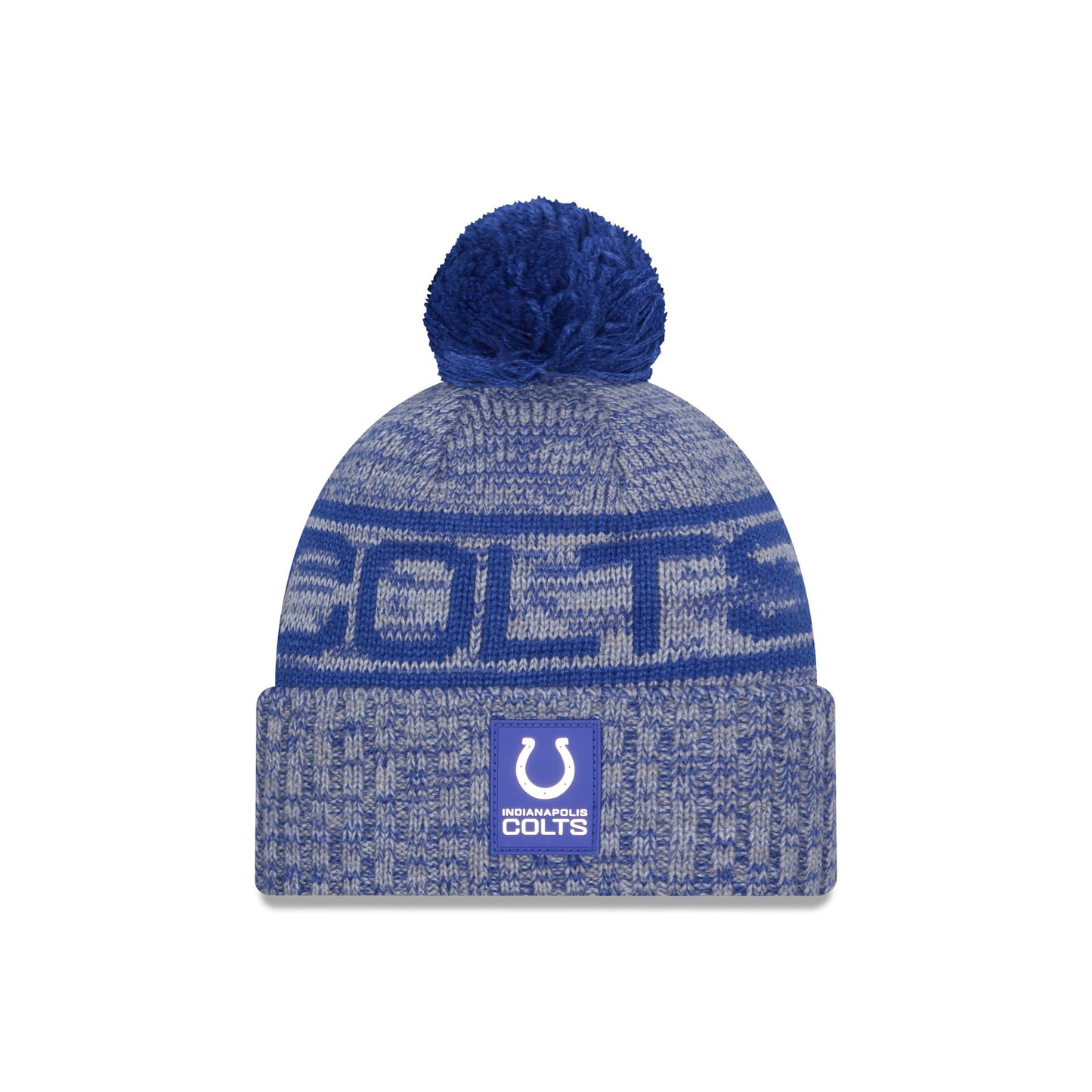 The Indianapolis Colts 2025 Sideline Cold Weather Pom Knit Hat features a sewn-down silicone Colts logo patch at the front cuff with a matching Official NFL Shield logo at the rear. Additional details include a team wordmark across the crown, a one-time removeable pom, and a fleece lining.