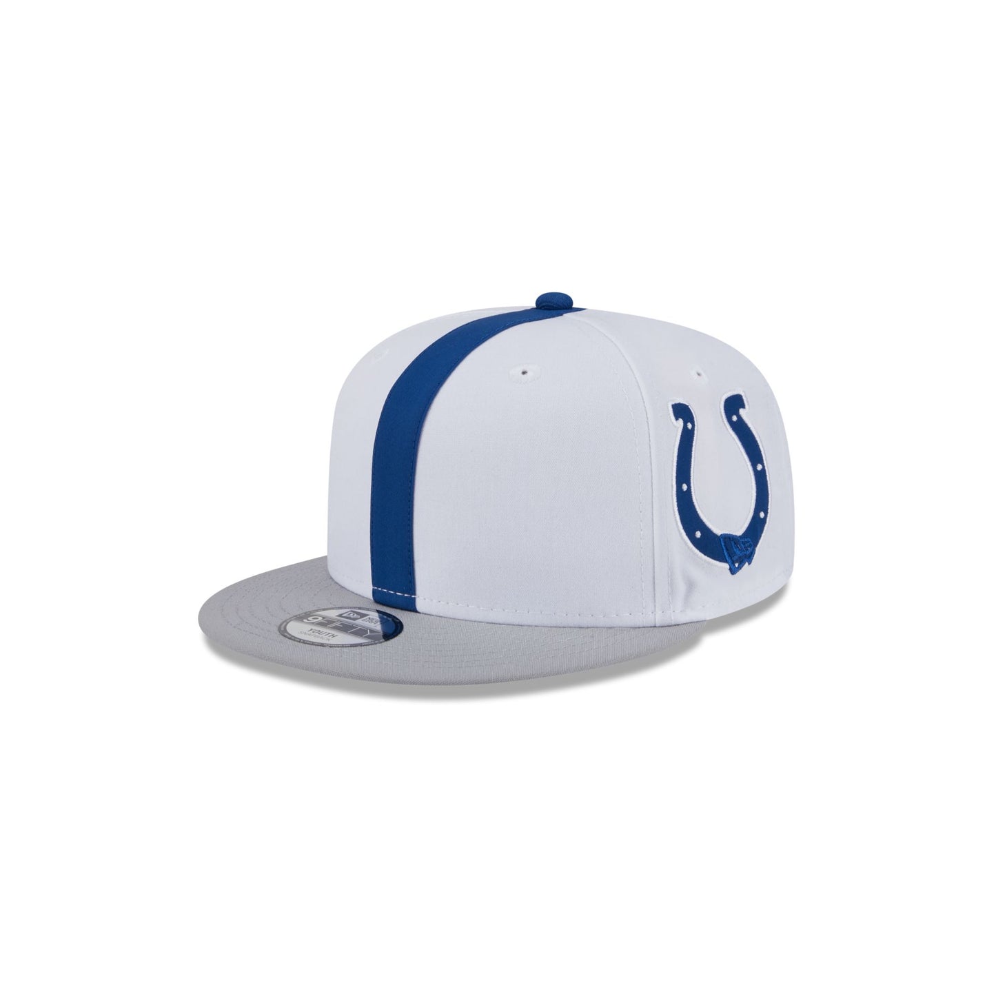 The Indianapolis Colts Kids Helmet 9FIFTY Snapback features an embroidered Colts helmet design throughout the hat with a team tag on a snapback closure at the rear.