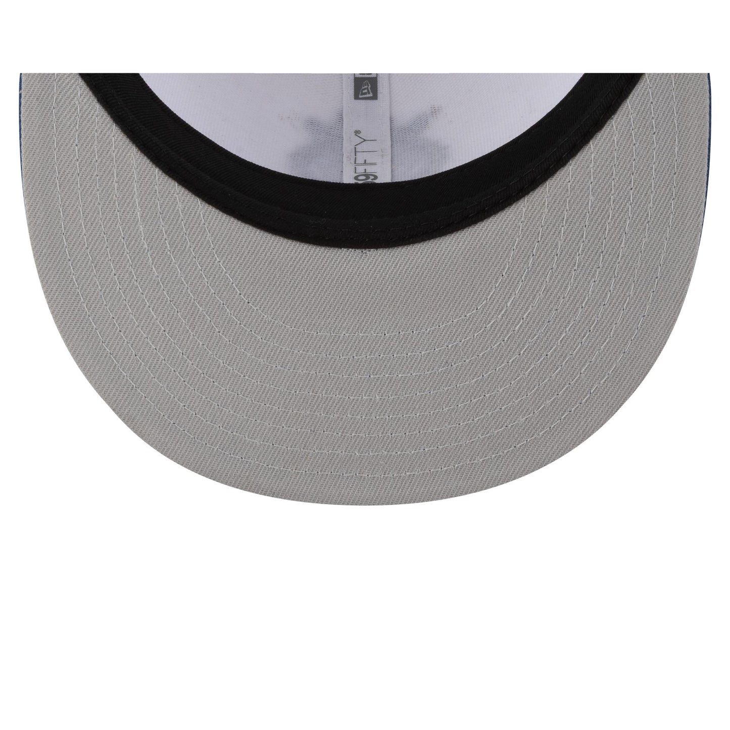 The Indianapolis Colts Mascot 59FIFTY Fitted Cap features an embroidered Colts mascot at the front panels with a matching NFL Shield at the rear, a 50th Anniversary team patch at the right-wear side, and a gray undervisor.