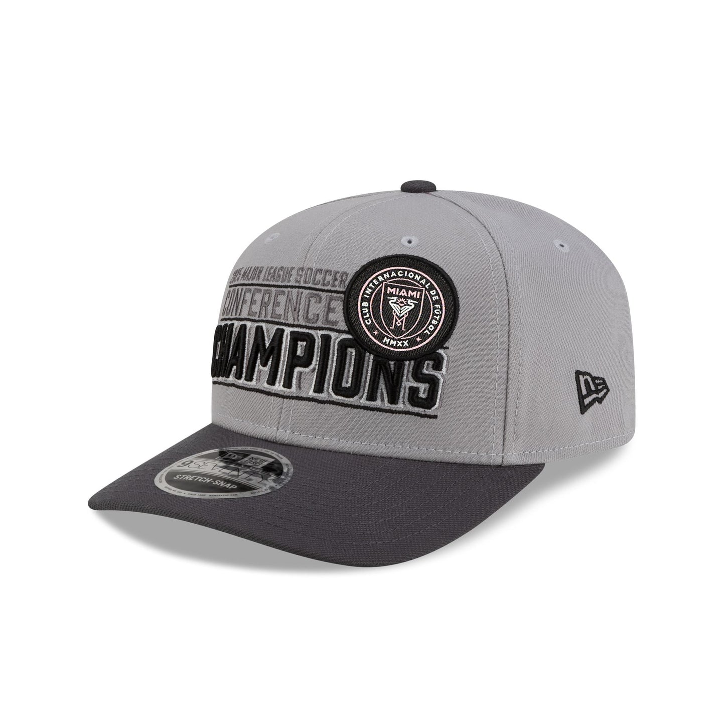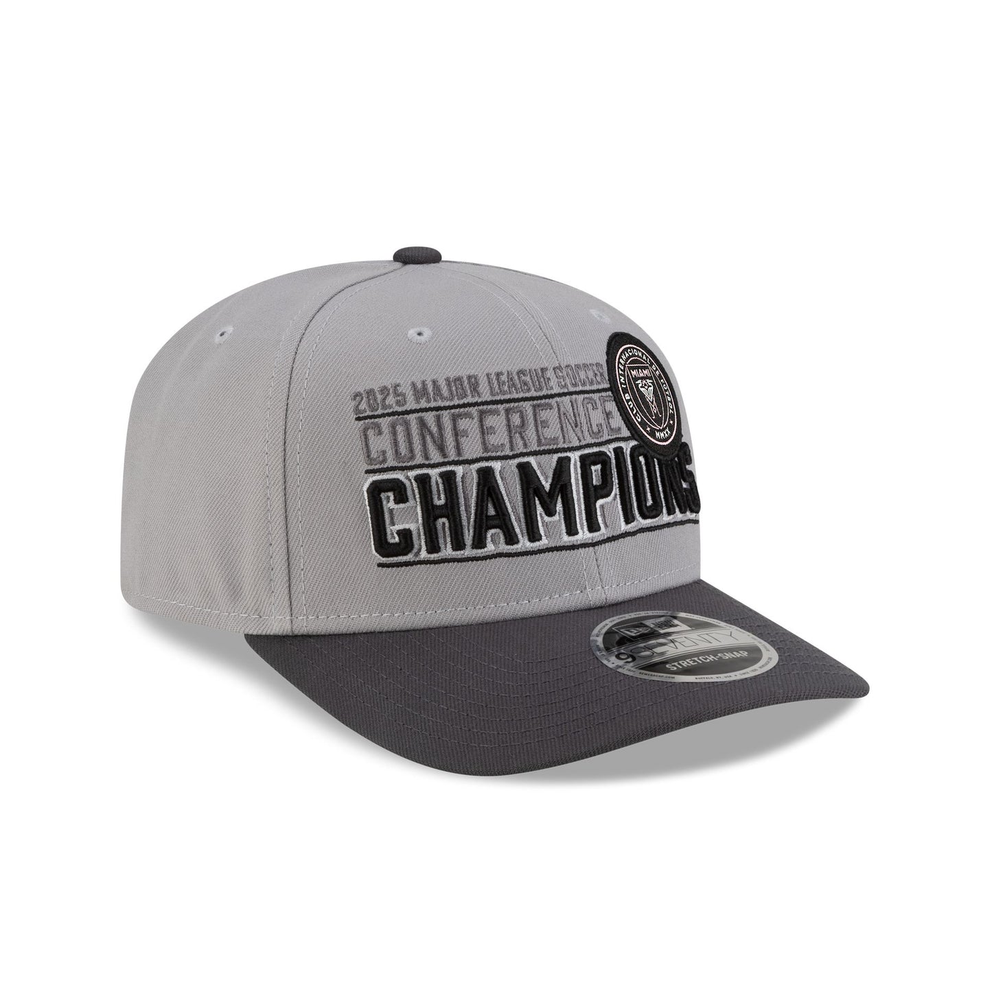 The Inter Miami 2025 Conference Champions 9SEVENTY Stretch-Snap features an embroidered Inter Miami 2025 Conference Champions graphic at the front panels with the MLS Shield above an adjustable stretch-snap closure at the rear.