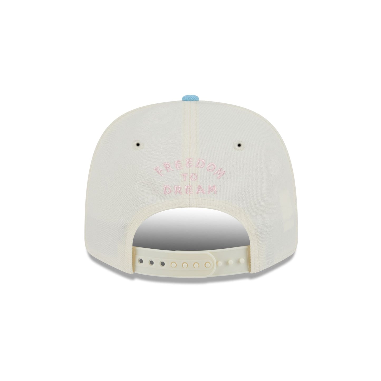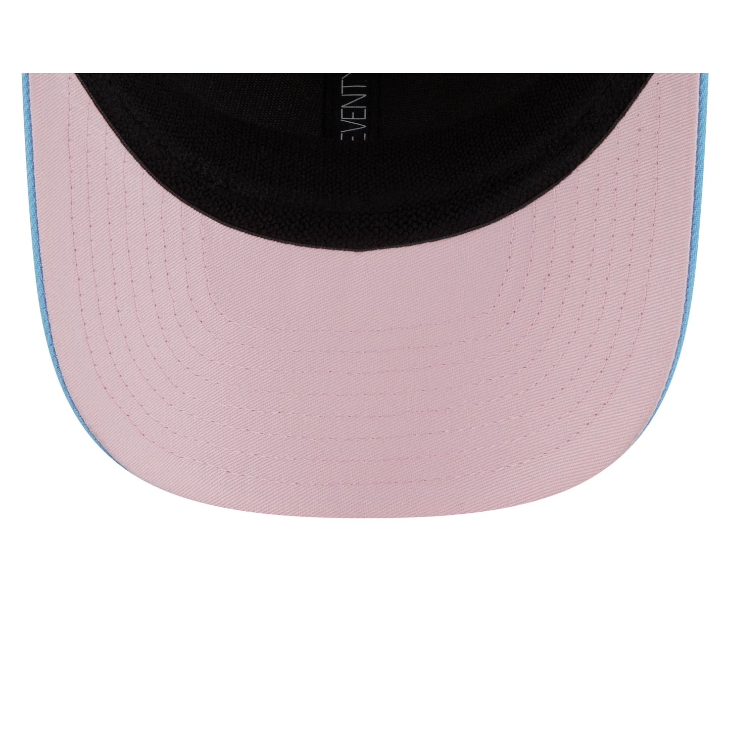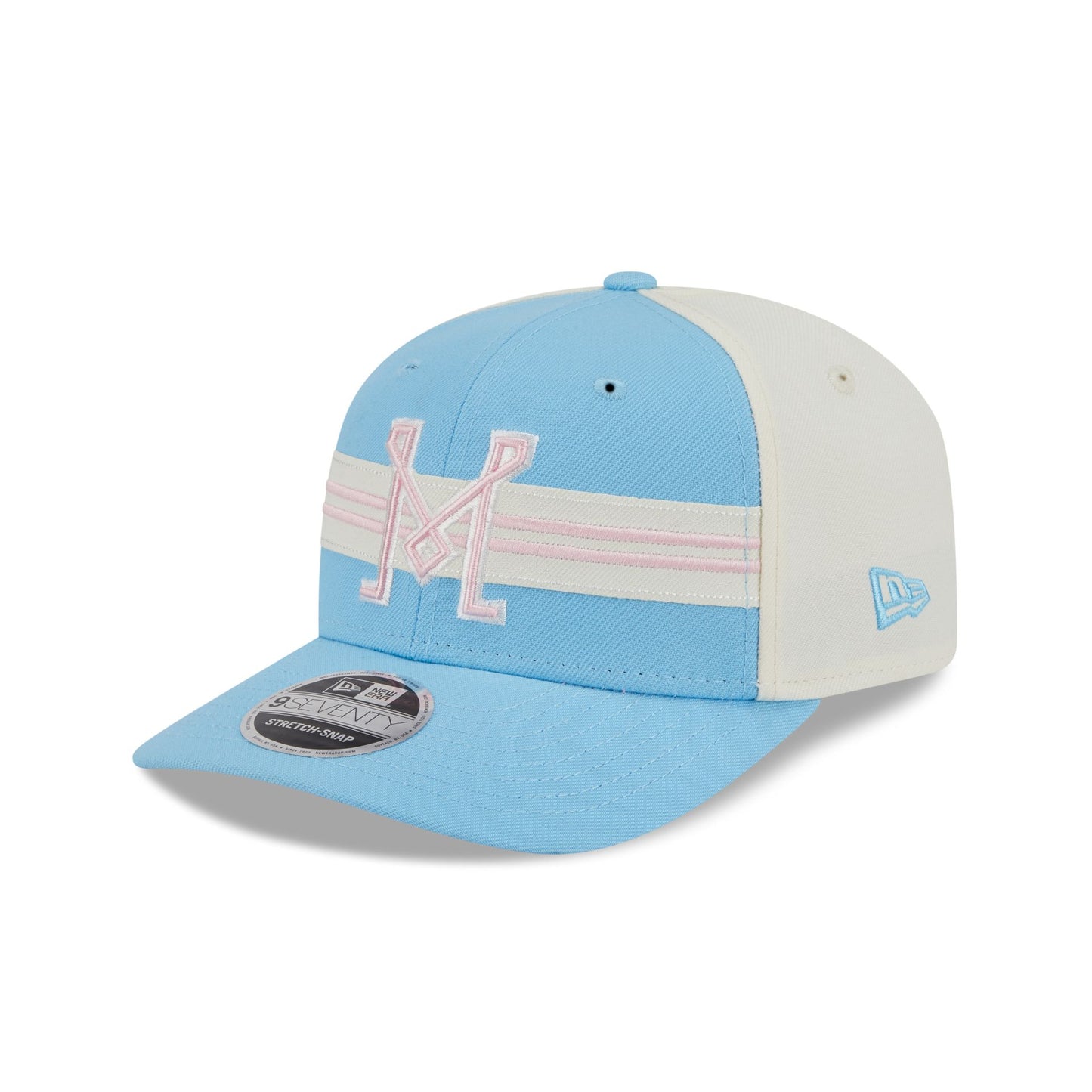The Inter Miami 2025 Jersey Hook Light Blue 9SEVENTY Stretch-Snap features an embroidered Inter Miami logo at the front panels with a team circle patch at the right-wear side. Additional details include a snapback closure at the rear and a pink undervisor.