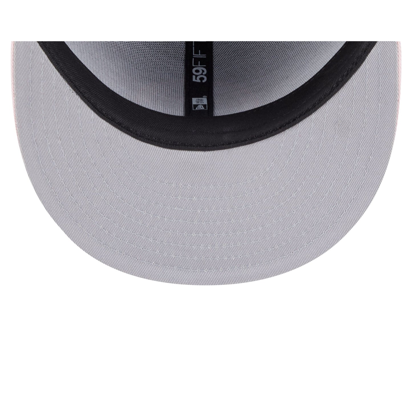 The Inter Miami 2025 MLS Kickoff 59FIFTY Fitted Cap features an embroidered Inter Miami logo at the front panels with a matching MLS Shield at the rear and a gray undervisor.