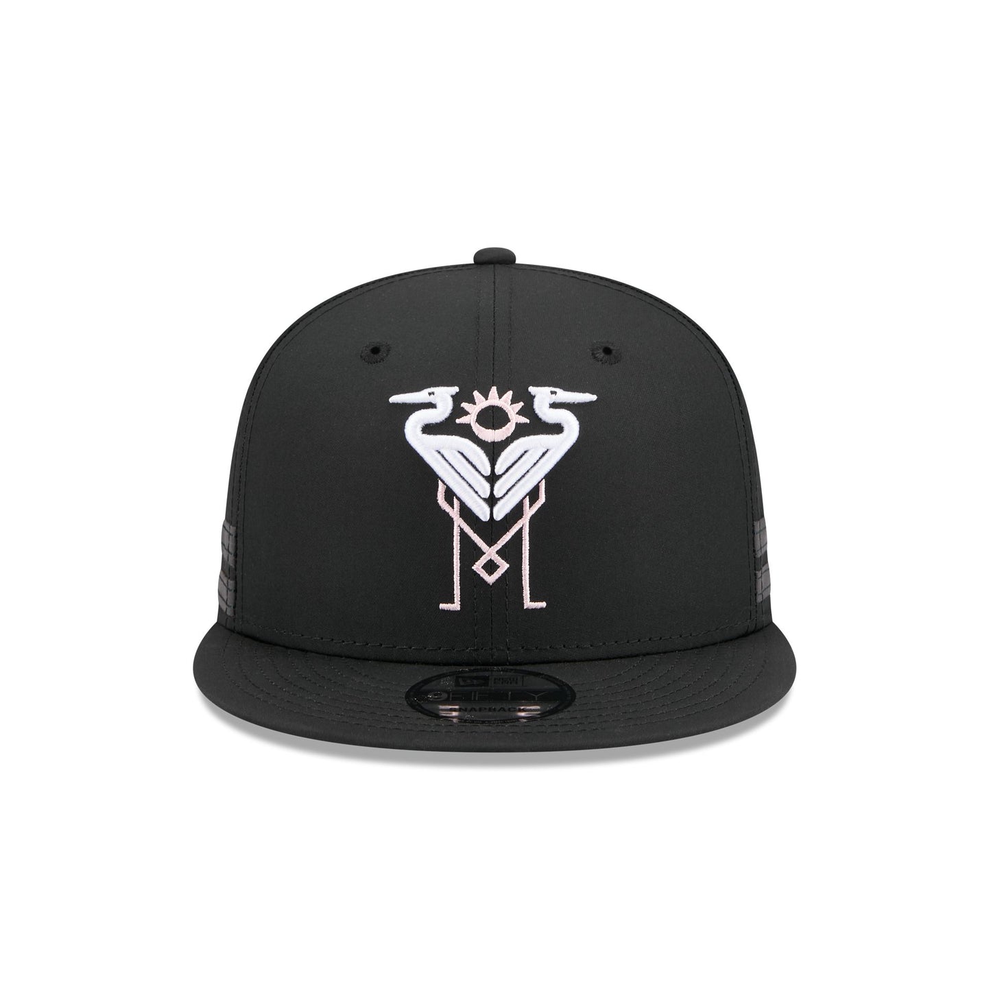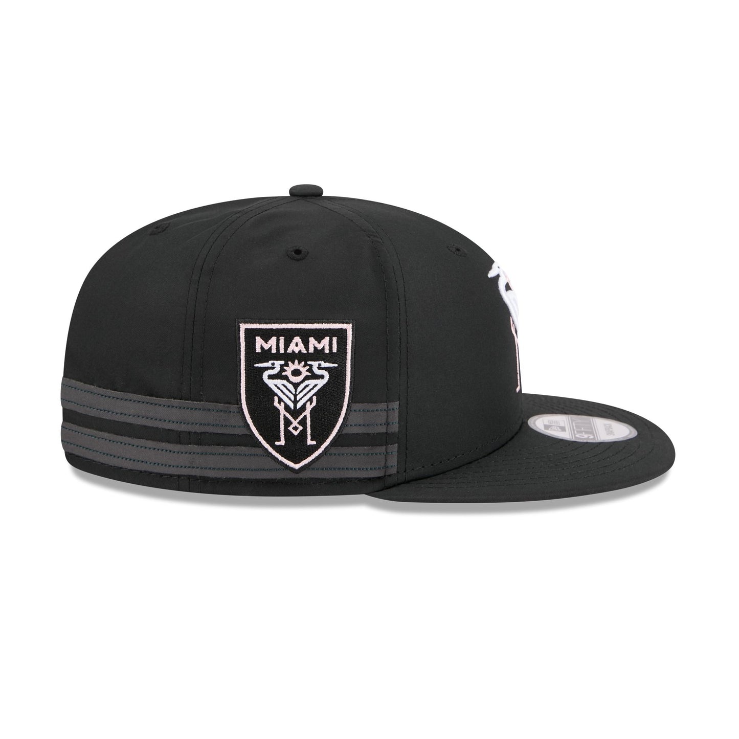 The Inter Miami 2026 Jersey Hook 9FIFTY Snapback features an embroidered Inter Miami logo at the front panels with a team patch at the right-wear side. Additional details include a team graphic above an adjustable snapback closure at the rear.