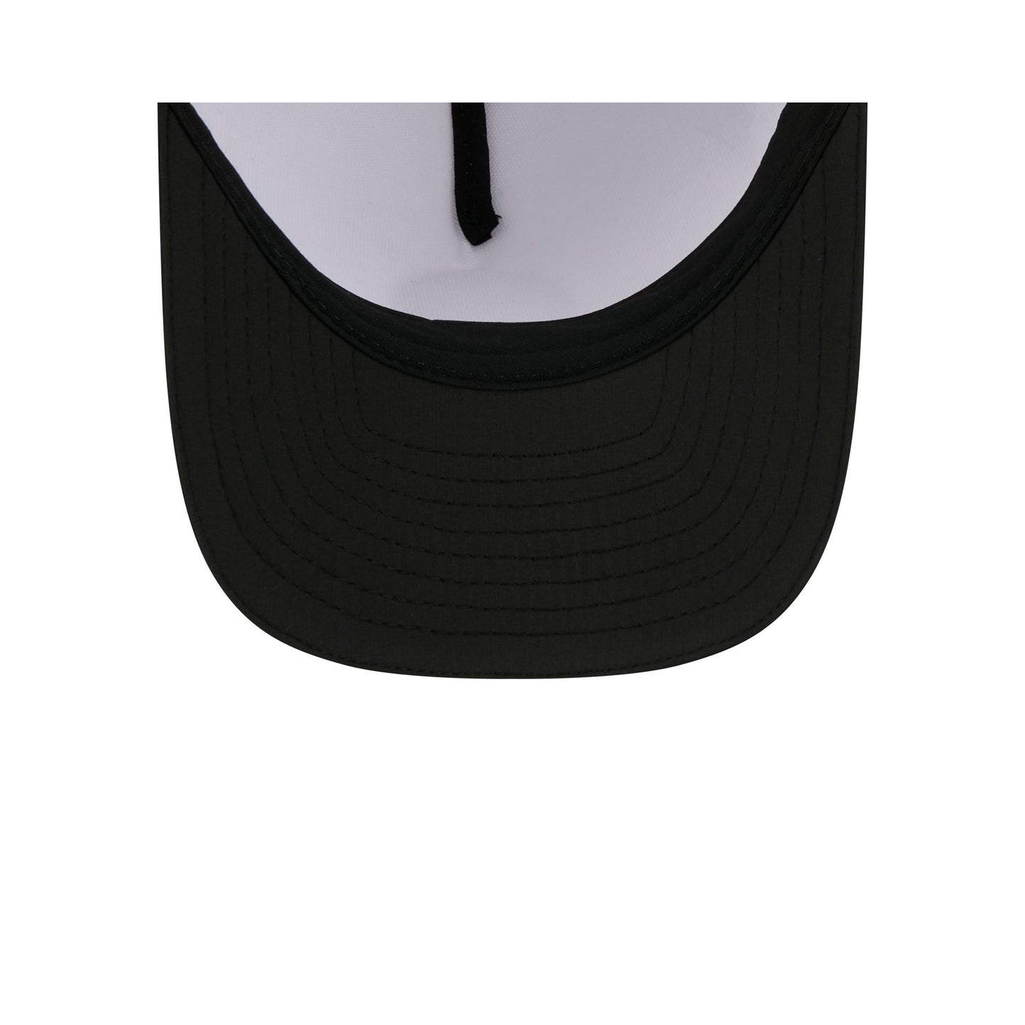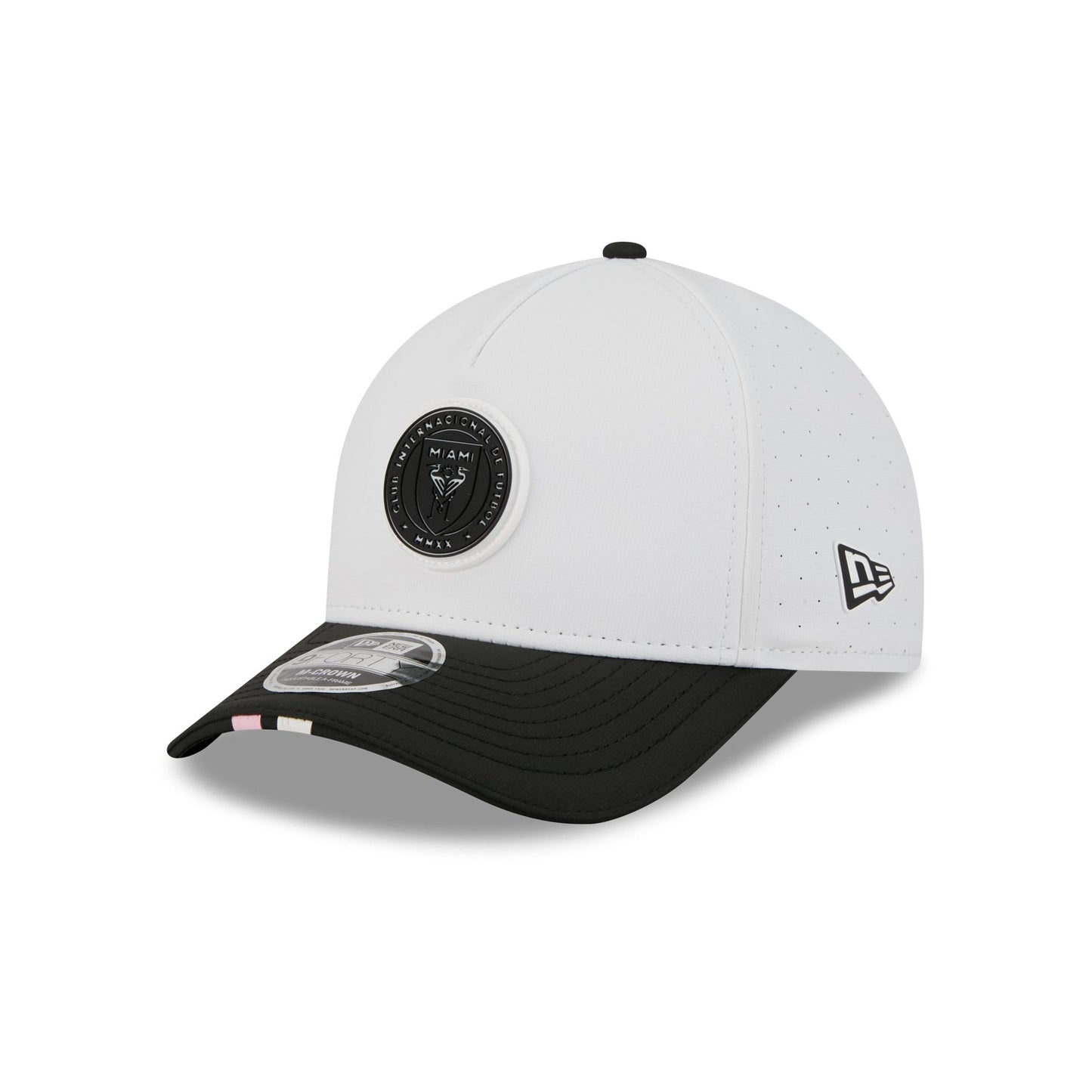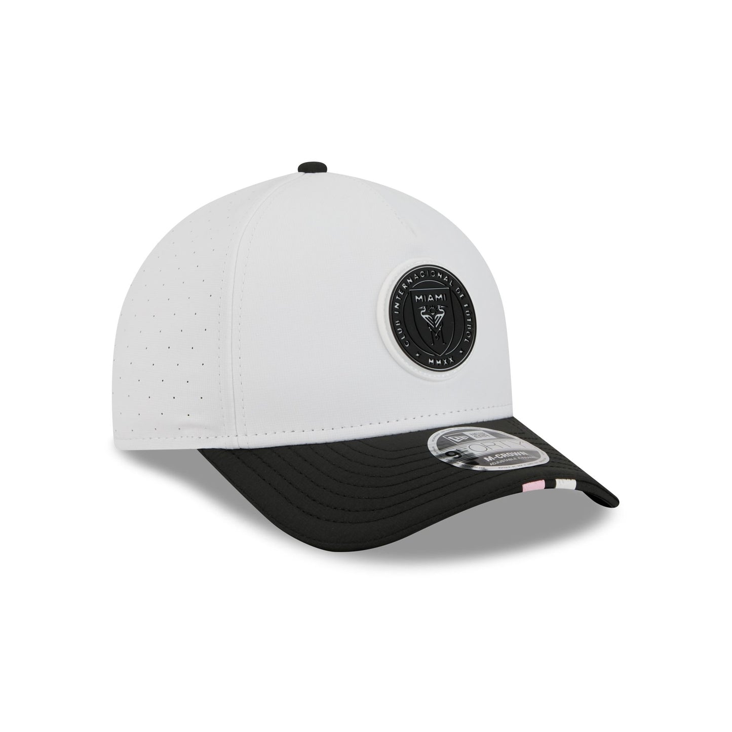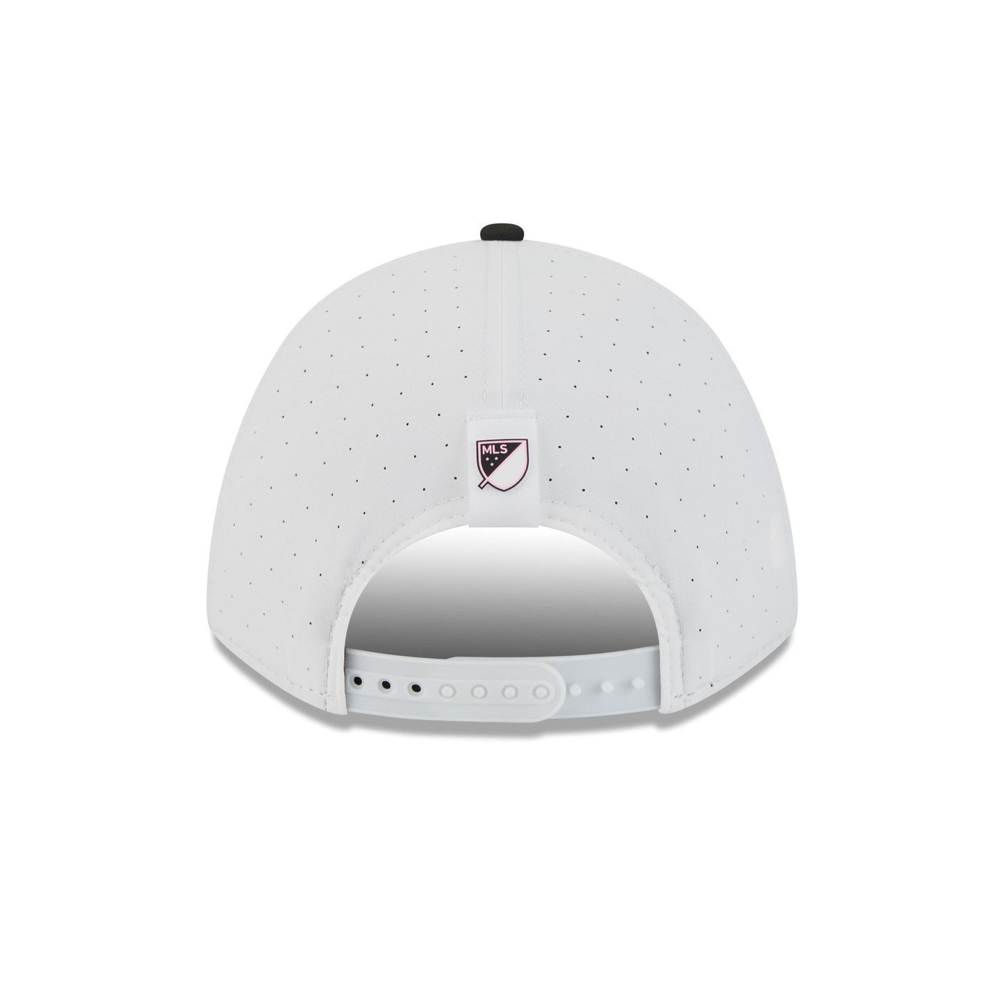 The Inter Miami 2026 MLS Kickoff 9FORTY M-Crown A-Frame Snapback features a stitch-down silicone Inter Miami logo patch at the front panel with a matching woven MLS Shield tag above a snapback closure at the rear. Additional details include a quill tech performance fabrication with a black visor accented with team color stripes at the front.