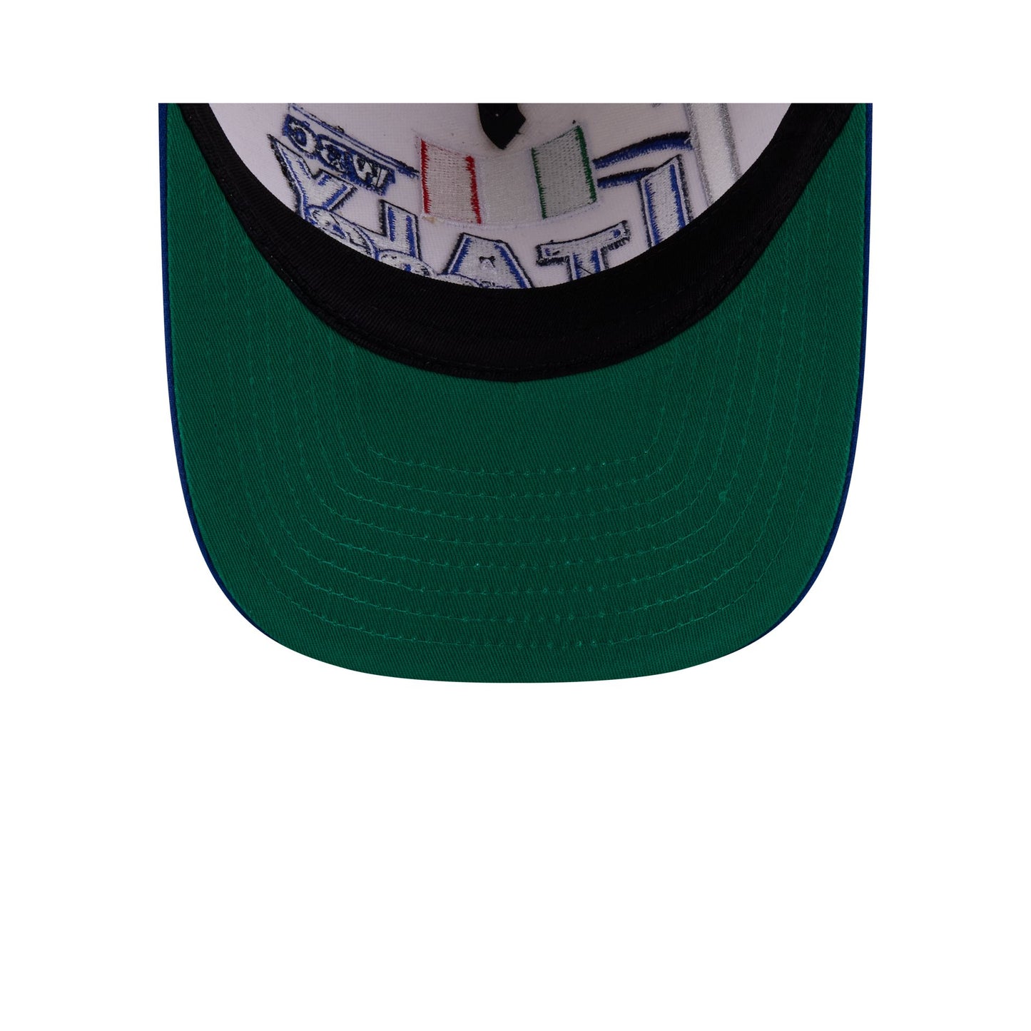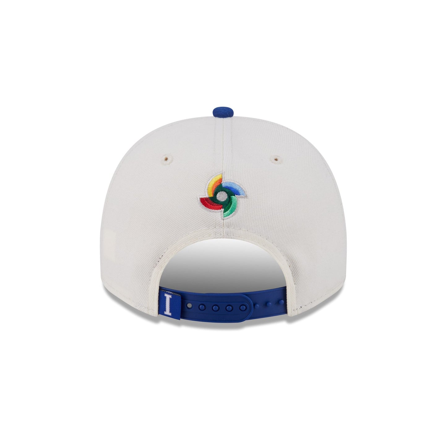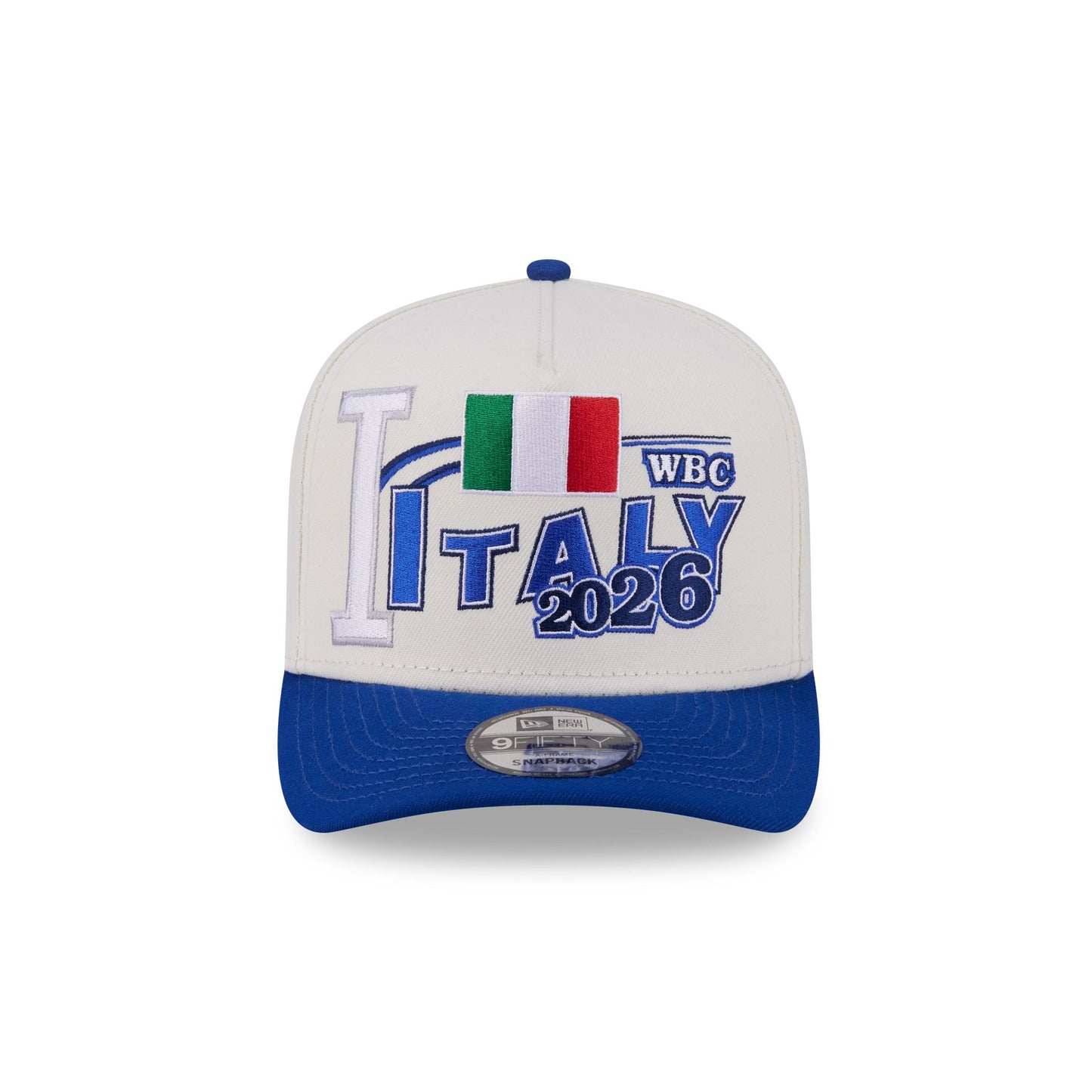 The Italy Chrome White Classic 9FIFTY A-Frame Snapback features an embroidered Italy graphic at the front panels with a World Baseball Classic logo above an adjustable snapback closure at the rear and a green undervisor.
