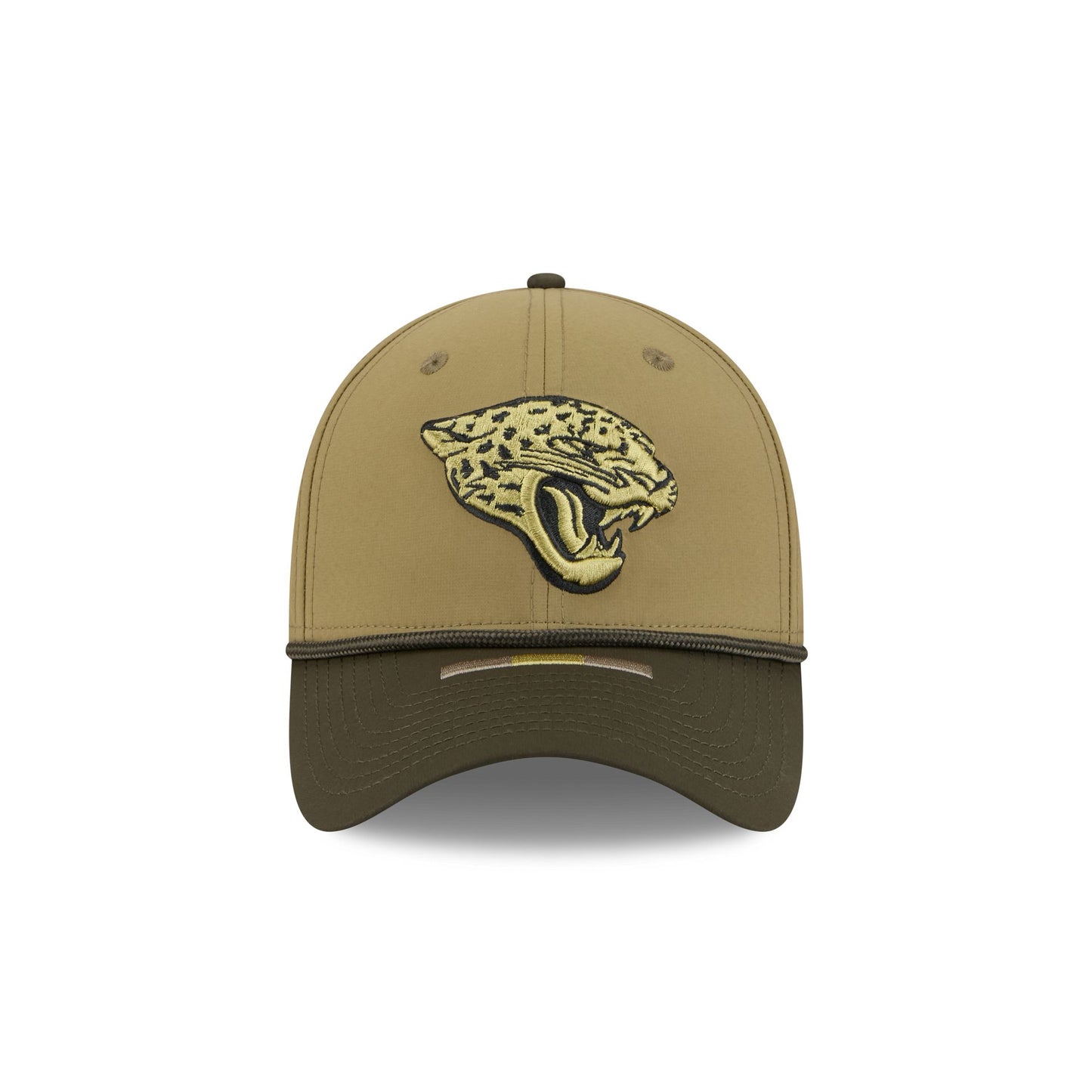 The Jacksonville Jaguars 2025 Salute to Service 39THIRTY Stretch Fit Cap features an embroidered Jaguars logo at the front panels with the official NFL Salute to Service patch at the rear and an American flag patch at the right-wear side. Additional details include three green stripes at the visor with a silicone team logo patch at a dark green undervisor and a digi camo interior fabrication.
