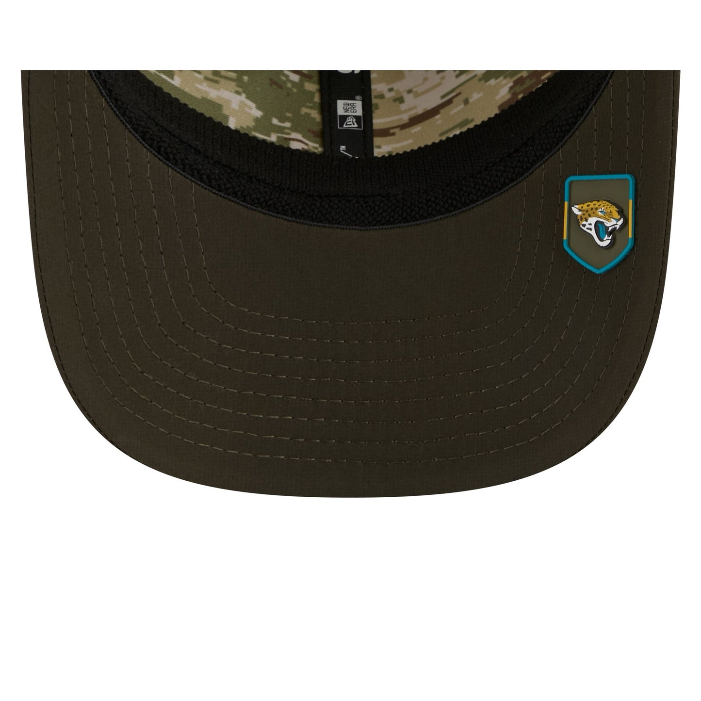 The Jacksonville Jaguars 2025 Salute to Service 9SEVENTY Trucker features an embroidered Jaguars logo at the front panels with the official NFL Salute to Service patch above a snapback closure at the rear. Additional details include an American flag patch at the right-wear side with a silicone team logo patch at a dark green undervisor and a digi camo interior fabrication.