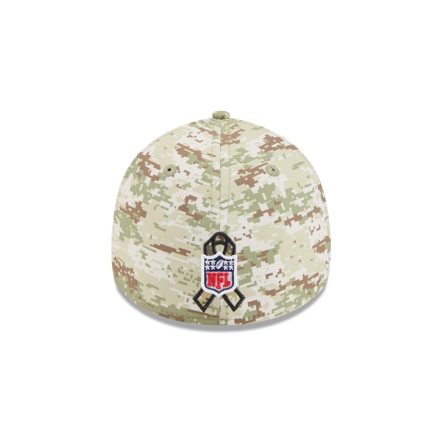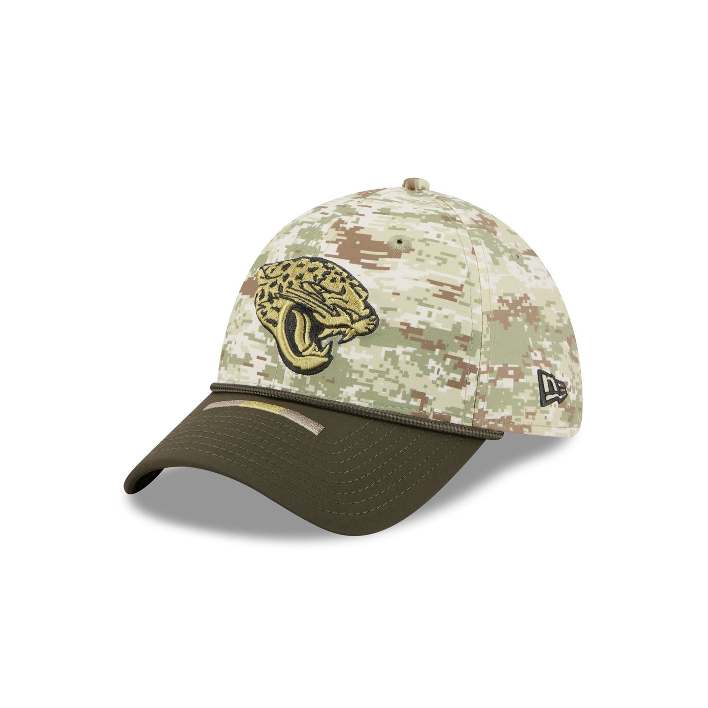 The Jacksonville Jaguars 2025 Salute to Service Digi Camo 39THIRTY Stretch Fit Cap features an embroidered Jaguars logo at the front panels with the official NFL Salute to Service patch at the rear and American flag patch at the right-wear side. Additional details include three green stripes at the visor and a silicone team logo patch at a dark green undervisor..
