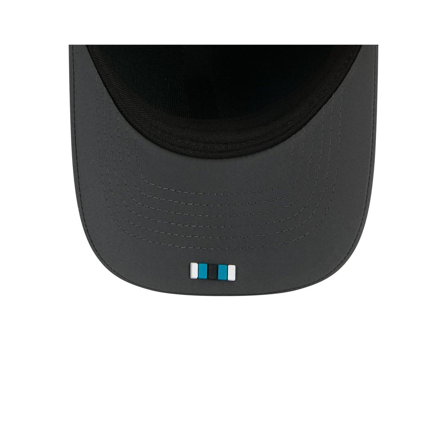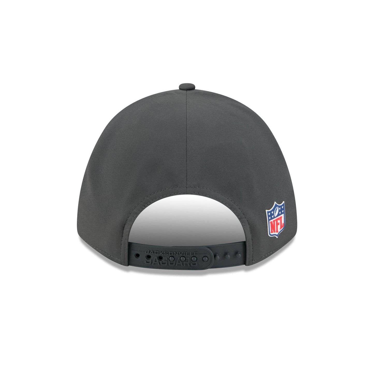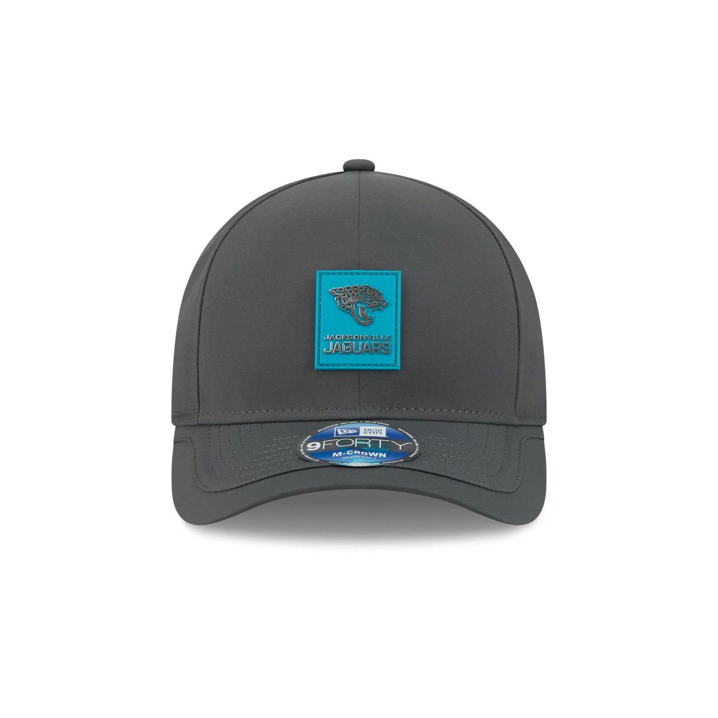The Jacksonville Jaguars 2025 Sideline Cold Weather Steel Clouds 9FORTY M-Crown Snapback features a sewn-down silicone Jaguars logo patch at the front panels with a water-repellent quill tech fabrication throughout and a quick-dry cushioned sweatband to absorb moisture. Additional details include the Official NFL Shield logo to the right of a soft silicone snapback closure at the rear. The crown has bonded seams to trap warmth and the undervisor is accented with a silicone transfer in the team’s colors.