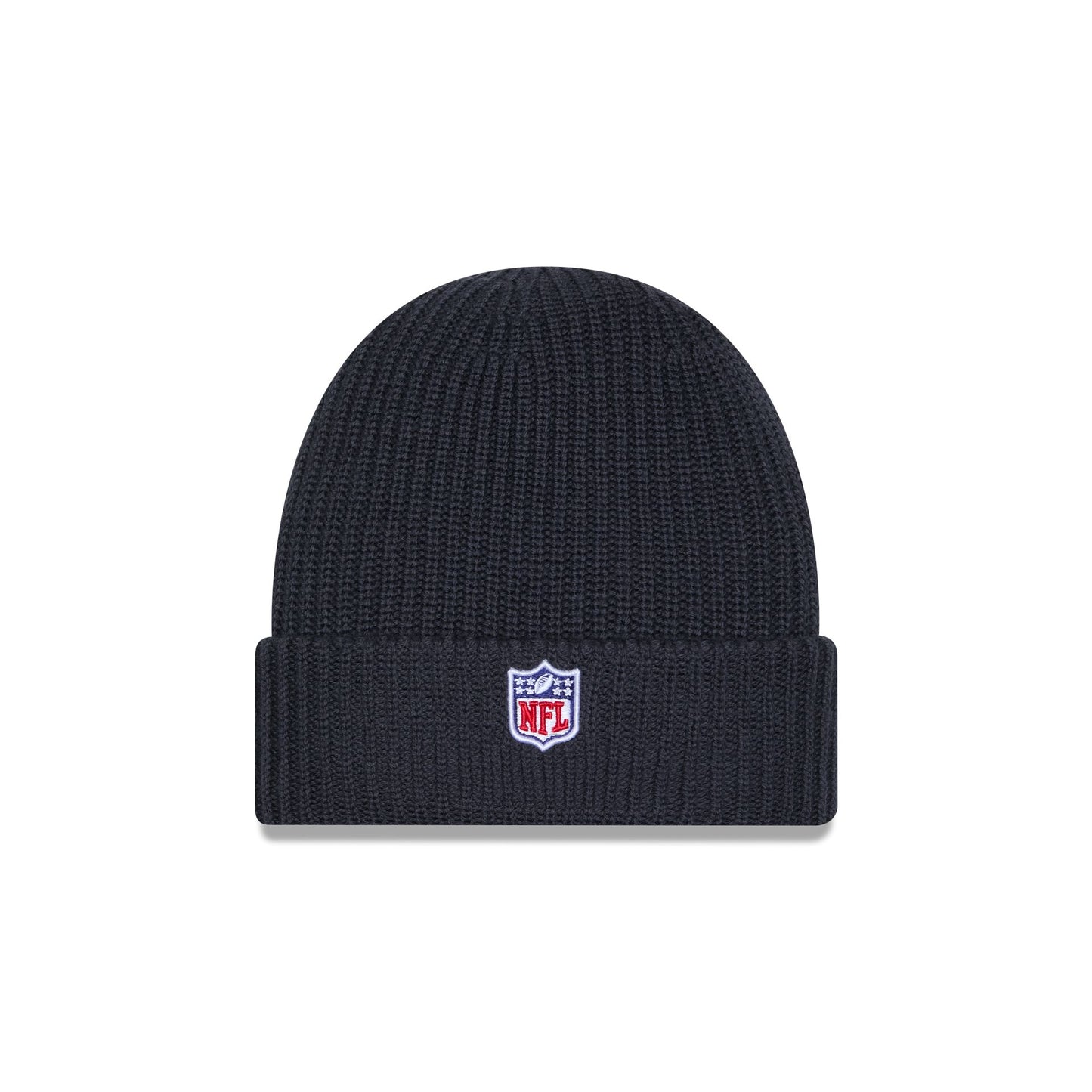 The Jacksonville Jaguars 2025 Sideline Cold Weather Steel Clouds Cuff Knit Beanie features a sewn-down silicone Jaguars logo patch at the front cuff with a matching Official NFL Shield logo at the rear. The beanie is knit from wool yarn and lined with fleece.