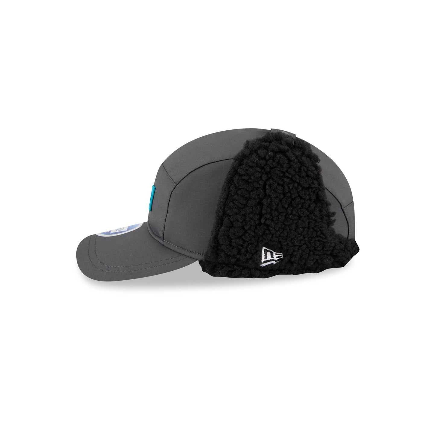 The Jacksonville Jaguars 2025 Sideline Cold Weather Steel Clouds Runner Dogear Adjustable Cap features a sewn-down silicone Jaguars logo patch at the front panels with a water-repellent quill tech fabrication throughout with an insulated crown and sherpa lining. Additional details include a buckle strap button secured at the top of the crown that folds down to cover the ears, and an adjustable elastic toggle at the back for a customizable fit.