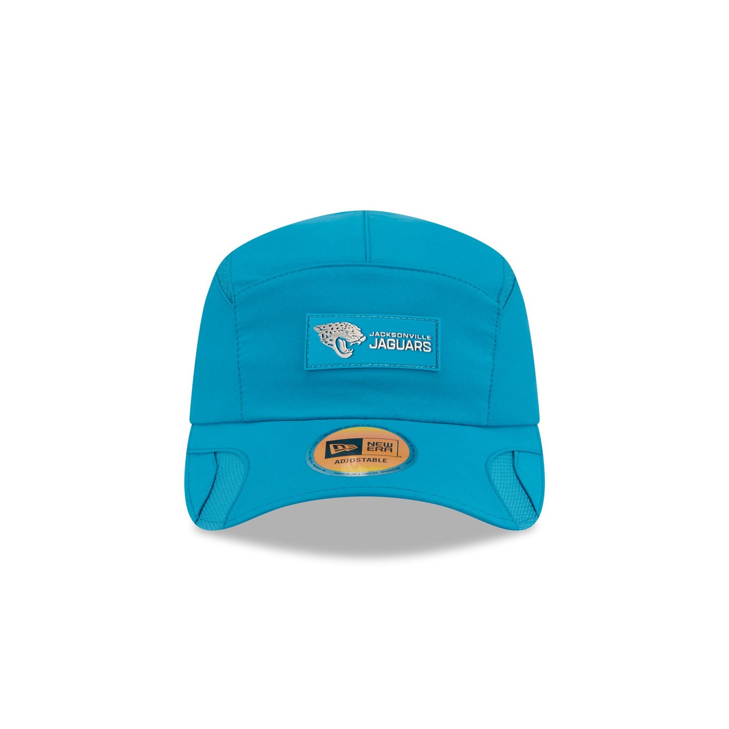 The Jacksonville Jaguars 2025 Sideline Hot Weather Runner Adjustable Cap features a sewn-down silicone Jaguars logo patch at the front panels with a water-repellent quill tech fabrication throughout and a quick-dry cushioned sweatband to absorb moisture. Additional details include the Official NFL Shield logo to the right of an adjustable hook-and-loop closure at the rear and mesh accents at the visor sides and side crown panels. The closure is accented with mesh a silicone transfer in the team’s colors.