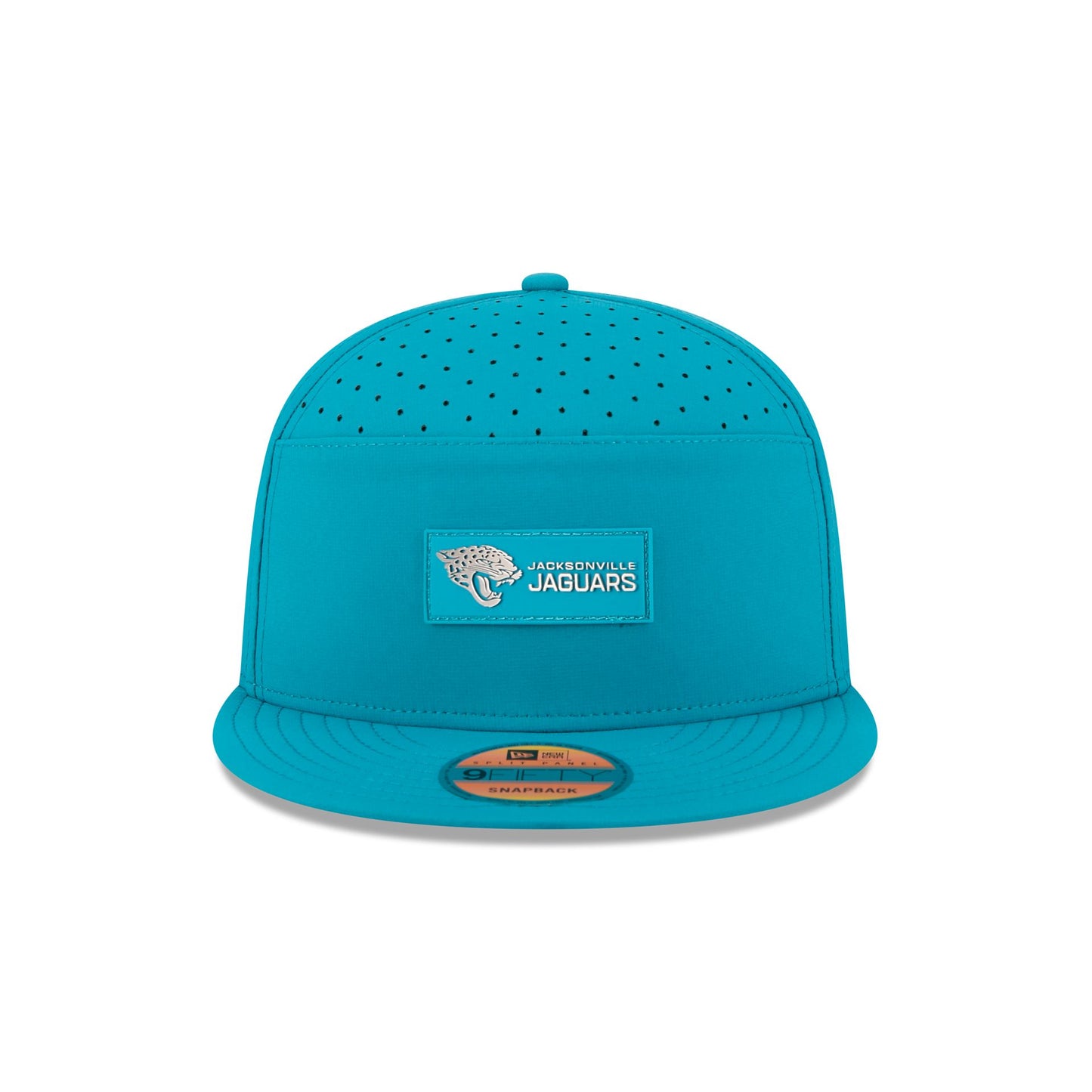 The Jacksonville Jaguars 2025 Sideline Hot Weather Split Panel 9FIFTY Snapback features a sewn-down silicone Jaguars logo patch at the front panels with a split-crown construction. The cap has a water-repellent quill tech fabrication throughout, with a quick-dry cushioned sweatband to absorb moisture. Additional details include the Official NFL Shield logo to the right of a soft silicone snapback closure at the rear. The undervisor is accented with a silicone transfer in the team’s colors.