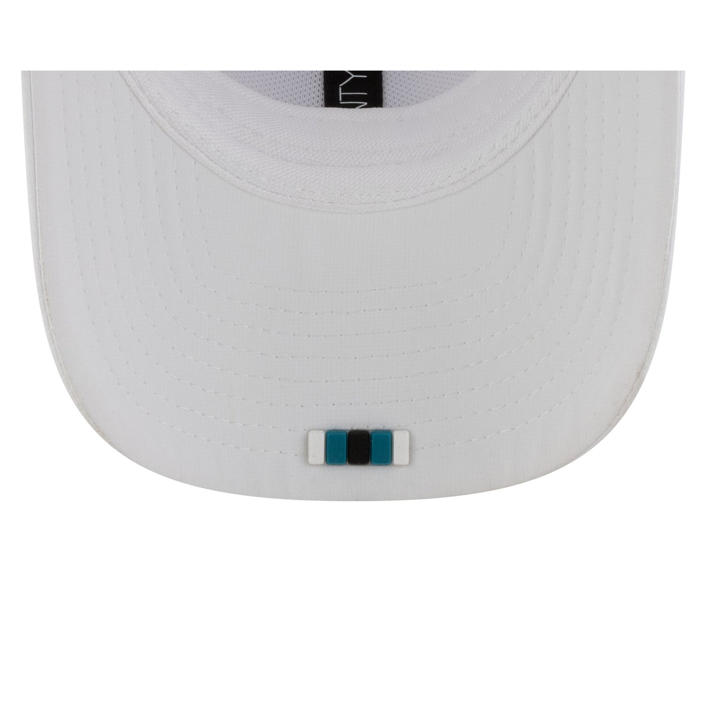 The Jacksonville Jaguars 2025 Sideline Hot Weather White 9SEVENTY Trucker features a sewn-down silicone Jaguars logo patch at the front panels with a water-repellent quill tech fabrication throughout and a quick-dry cushioned sweatband to absorb moisture. Additional details include the Official NFL Shield logo to the right of a soft silicone snapback closure at a light-weight mesh rear. The undervisor is accented with a silicone transfer in the team’s colors.