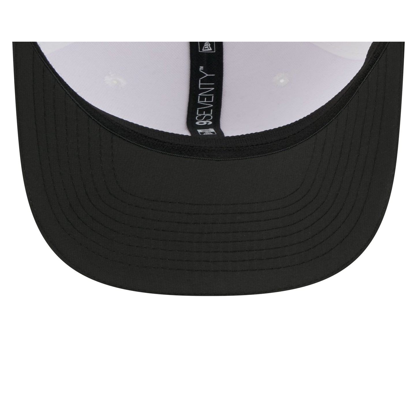 The Jacksonville Jaguars 2025 Training 9SEVENTY Stretch-Snap Cap features a silicone Jaguars patch at the front panels with team color stripes at the front of a black visor. Additional details include a silicone NFL Shield patch on a woven foldover tab above a snapback closure at the rear.