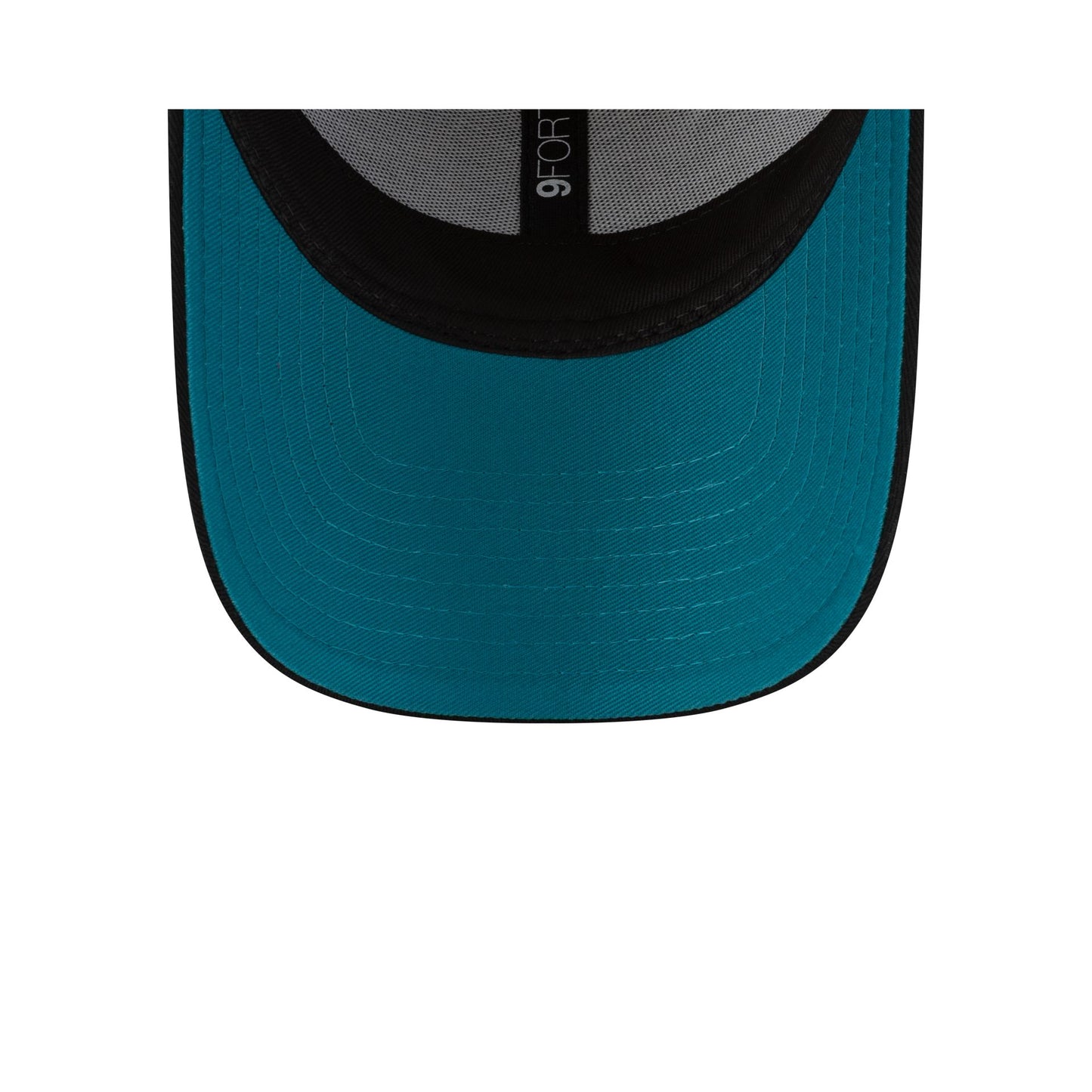 The Jacksonville Jaguars London Game 9FORTY Snapback features an embroidered Jaguars logo at the front panels with a London Game patch at the right-wear side and an adjustable snapback closure at the rear.